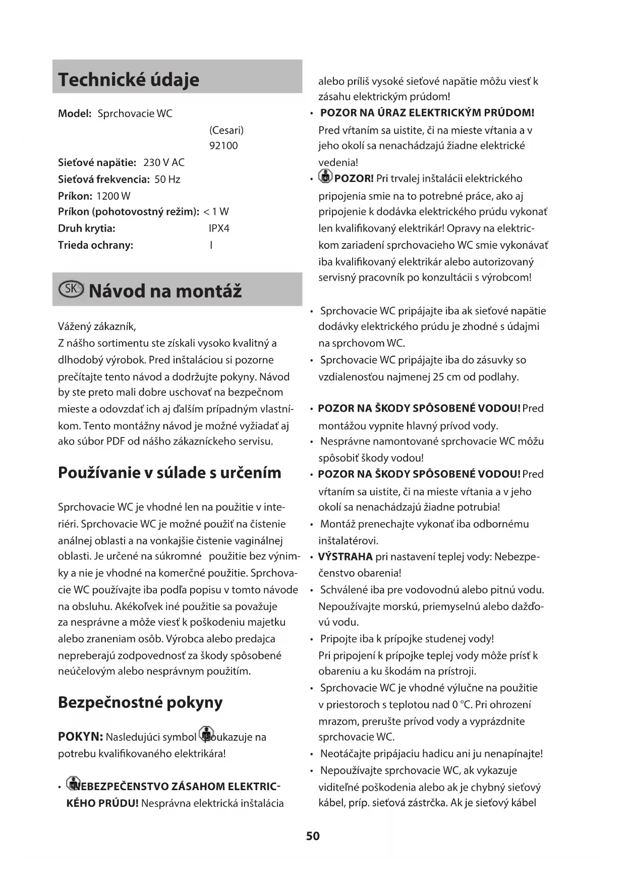 Sieťové napätie: 230 V AC Sieťová frekvencia: 50 Hz Príkon: 1200 W Príkon (pohotovostný režim): < 1 W Druh krytia: IPX4 Trieda ochrany: I SKSK Návod na montáž Vážený zákazník, Z nášho sortimentu ste získali vysoko kvalitný a dlhodobý výrobok. Pred inštaláciou si pozorne prečítajte tento návod a dodržujte pokyny. Návod by ste preto mali dobre uschovať na bezpečnom mieste a odovzdať ich aj ďalším prípadným vlastní- kom. Tento montážny návod je možné vyžiadať aj ako súbor PDF od nášho zákazníckeho servisu. Používanie v súlade s určením Sprchovacie WC je vhodné len na použitie v inte- riéri. Sprchovacie WC je možné použiť na čistenie análnej oblasti a na vonkajšie čistenie vaginálnej oblasti. Je určené na súkromné použitie bez výnim- ky a nie je vhodné na komerčné použitie. Sprchova- cie WC používajte iba podľa popisu v tomto návode na obsluhu. Akékoľvek iné použitie sa považuje za nesprávne a môže viesť k poškodeniu majetku alebo zraneniam osôb. Výrobca alebo predajca nepreberajú zodpovednosť za škody spôsobené neúčelovým alebo nesprávnym použitím. Bezpečnostné pokyny POKYN: Nasledujúci symbol poukazuje na potrebu kvalikovaného elektrikára!