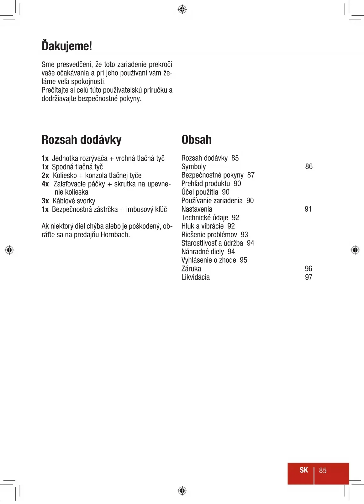 Ďakujeme! Sme presvedčení, že toto zariadenie prekročí vaše očakávania a pri jeho používaní vám že- láme veľa spokojnosti. Prečítajte si celú túto používateľskú príručku a dodržiavajte bezpečnostné pokyny. Rozsah dodávky 1x Jednotka rozrývača + vrchná tlačná tyč 1x Spodná tlačná tyč 2x Koliesko + konzola tlačnej tyče 4x Zaisťovacie páčky + skrutka na upevne- nie kolieska 3x Káblové svorky 1x Bezpečnostná zástrčka + imbusový kľúč Ak niektorý diel chýba alebo je poškodený, ob- ráťte sa na predajňu Hornbach. Obsah Rozsah dodávky 85 Symboly 86 Bezpečnostné pokyny 87 Prehľad produktu 90 Účel použitia 90 Používanie zariadenia 90 Nastavenia 91 Technické údaje 92 Hluk a vibrácie 92 Riešenie problémov 93 Starostlivosť a údržba 94 Náhradné diely 94 Vyhlásenie o zhode 95 Záruka 96 Likvidácia 97SK