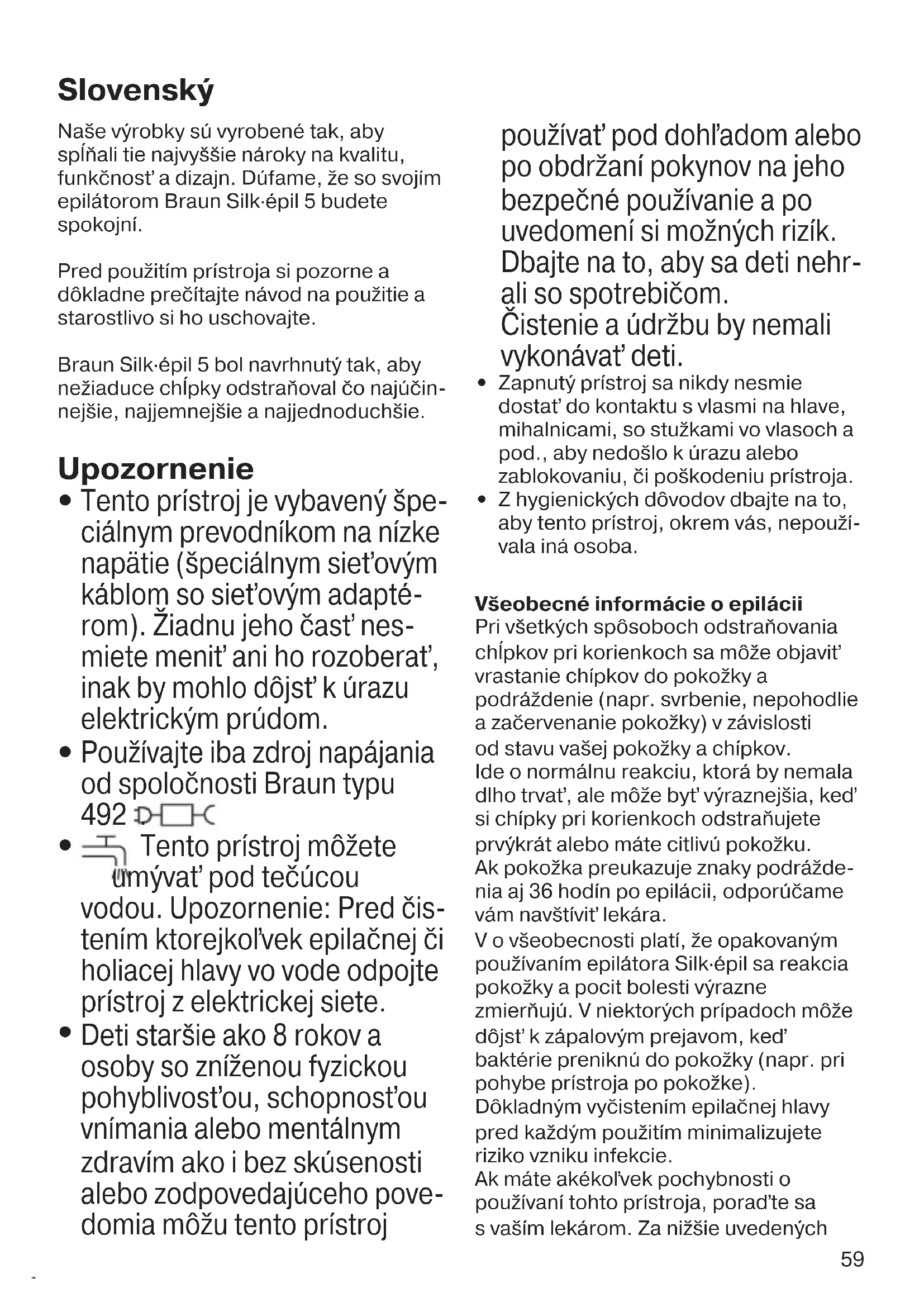 c Zastrihávanie chĺpkov dlhých do 5 mm: vyberte polohu « » a pripojte zastrihávací nadstavec (I). d Čistenie: Holiacu planžetu (II) nečistite kefkou, pretože by sa mohla poškodiť. e Holiace diely je potrebné pravidelne mazať každé 3 mesiace. f Keď pocítite znížený výkon holenia, vymeňte rámik s planžetou (II) a frézku (III). Náhradné diely si môžete zakúpiť u obchodného zástupcu alebo v zákazníckom servise Braun na lokalite www.service.braun.com. Nehoľte sa s poškodenou planžetou. Likvidácia Toto zariadenie obsahuje batérie a recyklovateľný elektronický odpad. V záujme ochrany životného prostredia nelikvidujte toto zariadenie jeho odhodením do domového odpadu, ale odneste ho do miestnej zberne druhotných surovín. 90340813_SE5_Power_MN.indd 6190340813_SE5_Power_MN.indd 61 02.06.22 10:4902.06.22 10:4962 Deklarovaná hodnota emisie hluku tohto spotrebiča je 72 dB(A), čo predstavuje hladinu A akustického výkonu vzhľadom na referenčný akustický výkon 1 pW. Právo na zmeny vyhradené. Záruka Poskytujeme dvojročnú záruku na výrobok s platnosťou od dátumu jeho zakúpenia. V záručnej lehote bezplatne odstránime všetky poruchy prístroja zapríčinené chybou materiálu alebo výroby, a to buď formou opravy, alebo výmenou celého prístroja (podľa nášho vlastného uváženia). Uvedená záruka je platná v každom štáte, v ktorom tento prístroj dodáva spoločnosť Braun alebo jej poverený distribútor. Záruka sa netýka nasledujúcich prípadov: poškodenie zapríčinené nesprávnym použitím, normálne opotrebovanie (napríklad plátkov holiaceho strojčeka alebo puzdra zastrihávača), ako aj poruchy, ktoré majú zanedbateľný účinok na hodnotu alebo funkciu prístroja. Ak opravu uskutoční neautorizovaná osoba a ak sa nepoužijú pôvodné náhradné súčiastky spoločnosti Braun, platnosť záruky bude ukončená. Ak v záručnej lehote požadujete vykonanie servisnej opravy, odovzdajte celý prístroj s potvrdením o nákupe v autorizovanom servisnom stredisku spoločnosti Braun alebo ho do strediska zašlite. 90340813_SE5_Power_MN.indd 6290340813_SE5_Power_MN.indd 62 02.06.22 10:4902.06.22 10:4963 Termékeinket a legmagasabb minőségi, funkcionális és formatervezői elvárások alapján terveztük. Reméljük, örömét leli majd új Braun Silk·épil 5 készülékében! Kérjük, hogy a használat megkezdése előtt figyelmesen olvassa át a használati útmutatót, és emlékeztetőként őrizze meg azt! A Braun Silk·épil 5 epilátort úgy tervezték, hogy a nem kívánatos szőrszálakat hatékonyan,kíméletesen és egyszerűen távolítsa el. Figyelmeztetés