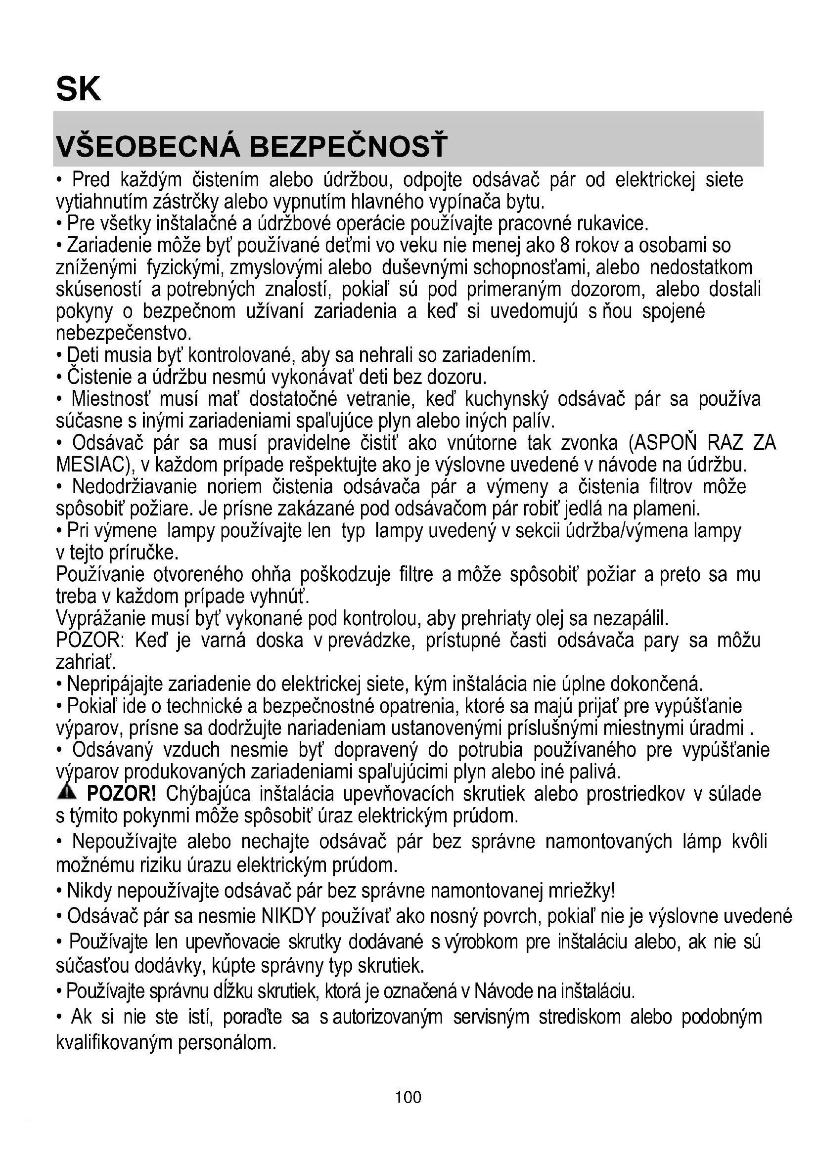 - Pri výmene lampy používajte len typ lampy uvedený v sekcii údržba/výmena lampy v tejto príručke. Používanie otvoreného ohňa poškodzuje filtre a môže spôsobiť požiar a preto sa mu treba v každom prípade vyhnúť. Vyprážanie musí byť vykonané pod kontrolou, aby prehriaty olej sa nezapálil. POZOR: Keď je varná doska v prevádzke, prístupné časti odsávača pary sa môžu zahriať.