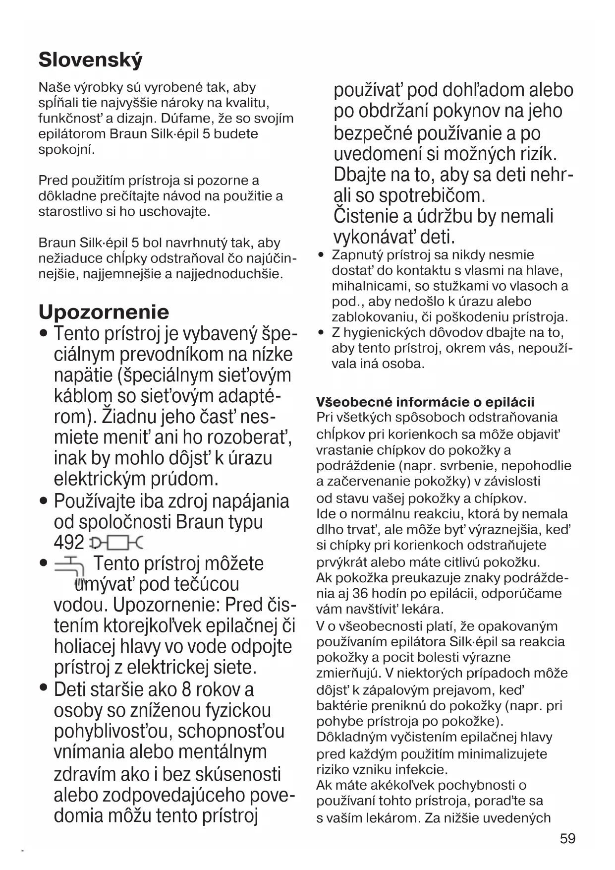 c Zastrihávanie chĺpkov dlhých do 5 mm: vyberte polohu « » a pripojte zastrihávací nadstavec (I). d Čistenie: Holiacu planžetu (II) nečistite kefkou, pretože by sa mohla poškodiť. e Holiace diely je potrebné pravidelne mazať každé 3 mesiace. f Keď pocítite znížený výkon holenia, vymeňte rámik s planžetou (II) a frézku (III). Náhradné diely si môžete zakúpiť u obchodného zástupcu alebo v zákazníckom servise Braun na lokalite www.service.braun.com. Nehoľte sa s poškodenou planžetou. Likvidácia Toto zariadenie obsahuje batérie a recyklovateľný elektronický odpad. V záujme ochrany životného prostredia nelikvidujte toto zariadenie jeho odhodením do domového odpadu, ale odneste ho do miestnej zberne druhotných surovín. 90340813_SE5_Power_MN.indd 6190340813_SE5_Power_MN.indd 61 02.06.22 10:4902.06.22 10:4962 Deklarovaná hodnota emisie hluku tohto spotrebiča je 72 dB(A), čo predstavuje hladinu A akustického výkonu vzhľadom na referenčný akustický výkon 1 pW. Právo na zmeny vyhradené. Záruka Poskytujeme dvojročnú záruku na výrobok s platnosťou od dátumu jeho zakúpenia. V záručnej lehote bezplatne odstránime všetky poruchy prístroja zapríčinené chybou materiálu alebo výroby, a to buď formou opravy, alebo výmenou celého prístroja (podľa nášho vlastného uváženia). Uvedená záruka je platná v každom štáte, v ktorom tento prístroj dodáva spoločnosť Braun alebo jej poverený distribútor. Záruka sa netýka nasledujúcich prípadov: poškodenie zapríčinené nesprávnym použitím, normálne opotrebovanie (napríklad plátkov holiaceho strojčeka alebo puzdra zastrihávača), ako aj poruchy, ktoré majú zanedbateľný účinok na hodnotu alebo funkciu prístroja. Ak opravu uskutoční neautorizovaná osoba a ak sa nepoužijú pôvodné náhradné súčiastky spoločnosti Braun, platnosť záruky bude ukončená. Ak v záručnej lehote požadujete vykonanie servisnej opravy, odovzdajte celý prístroj s potvrdením o nákupe v autorizovanom servisnom stredisku spoločnosti Braun alebo ho do strediska zašlite. 90340813_SE5_Power_MN.indd 6290340813_SE5_Power_MN.indd 62 02.06.22 10:4902.06.22 10:4963 Termékeinket a legmagasabb minőségi, funkcionális és formatervezői elvárások alapján terveztük. Reméljük, örömét leli majd új Braun Silk·épil 5 készülékében! Kérjük, hogy a használat megkezdése előtt figyelmesen olvassa át a használati útmutatót, és emlékeztetőként őrizze meg azt! A Braun Silk·épil 5 epilátort úgy tervezték, hogy a nem kívánatos szőrszálakat hatékonyan,kíméletesen és egyszerűen távolítsa el. Figyelmeztetés