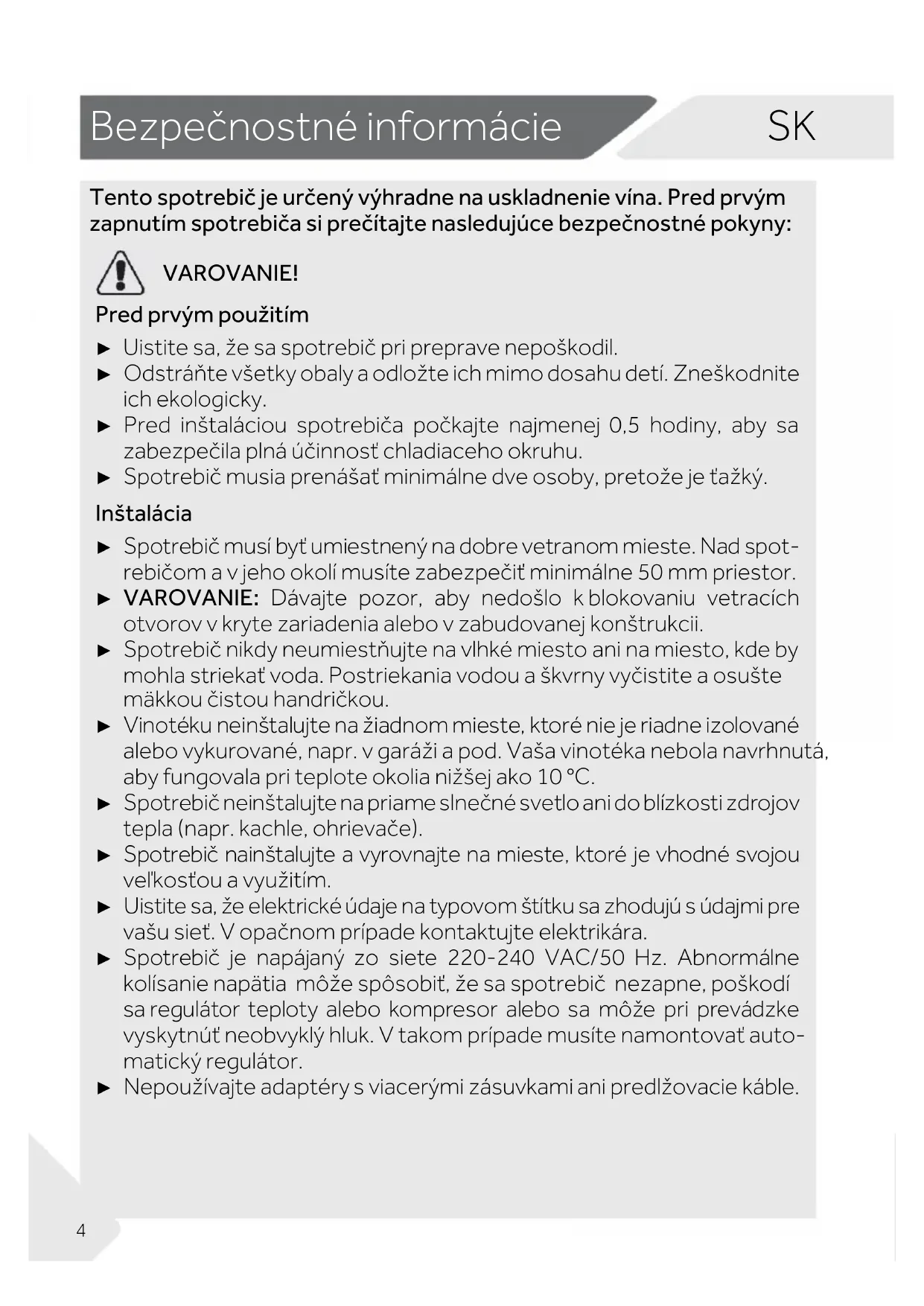 VAROVANIE! Pred prvým použitím ► Uistite sa, že sa spotrebič pri preprave nepoškodil. ► Odstráňte všetky obaly a odložte ich mimo dosahu detí. Zneškodnite ich ekologicky. ► Pred inštaláciou spotrebiča počkajte najmenej 0,5 hodiny, aby sa zabezpečila plná účinnosť chladiaceho okruhu. ► Spotrebič musia prenášať minimálne dve osoby, pretože je ťažký. Inštalácia ► Spotrebič musí byť umiestnený na dobre vetranom mieste. Nad spot- rebičom a v jeho okolí musíte zabezpečiť minimálne 50 mm priestor. ► VAROVANIE: Dávajte pozor, aby nedošlo k blokovaniu vetracích otvorov v kryte zariadenia alebo v zabudovanej konštrukcii. ► Spotrebič nikdy neumiestňujte na vlhké miesto ani na miesto, kde by mohla striekať voda. Postriekania vodou a škvrny vyčistite a osušte mäkkou čistou handričkou. ► Vinotéku neinštalujte na žiadnom mieste, ktoré nie je riadne izolované alebo vykurované, napr. v garáži a pod. Vaša vinotéka nebola navrhnutá, aby fungovala pri teplote okolia nižšej ako 10 °C. ► Spotrebič neinštalujte na priame slnečné svetlo ani do blízkosti zdrojov tepla (napr. kachle, ohrievače). ► Spotrebič nainštalujte a vyrovnajte na mieste, ktoré je vhodné svojou veľkosťou a využitím. ► Uistite sa, že elektrické údaje na typovom štítku sa zhodujú s údajmi pre vašu sieť. V opačnom prípade kontaktujte elektrikára. ► Spotrebič je napájaný zo siete 220-240 VAC/50 Hz. Abnormálne kolísanie napätia môže spôsobiť, že sa spotrebič nezapne, poškodí sa regulátor teploty alebo kompresor alebo sa môže pri prevádzke vyskytnúť neobvyklý hluk. V takom prípade musíte namontovať auto- matický regulátor. ► Nepoužívajte adaptéry s viacerými zásuvkami ani predlžovacie káble.SK Bezpečnostné informácie