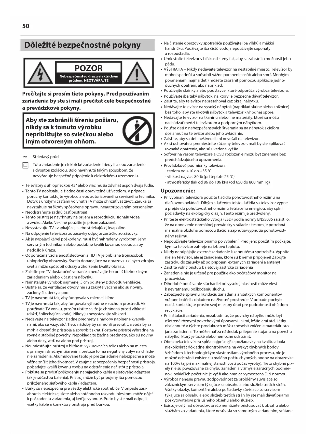 - Tento TV neobsahuje žiadne časti opraviteľné užívateľom. Vprípade poruchy kontaktujte výrobcu alebo autorizovaného servisného technika. Dotyk surčitými časťami vo vnútri TV môže ohroziť váš život. Záruka sa nevzťahuje na škody spôsobené opravou neautorizovaným personálom.