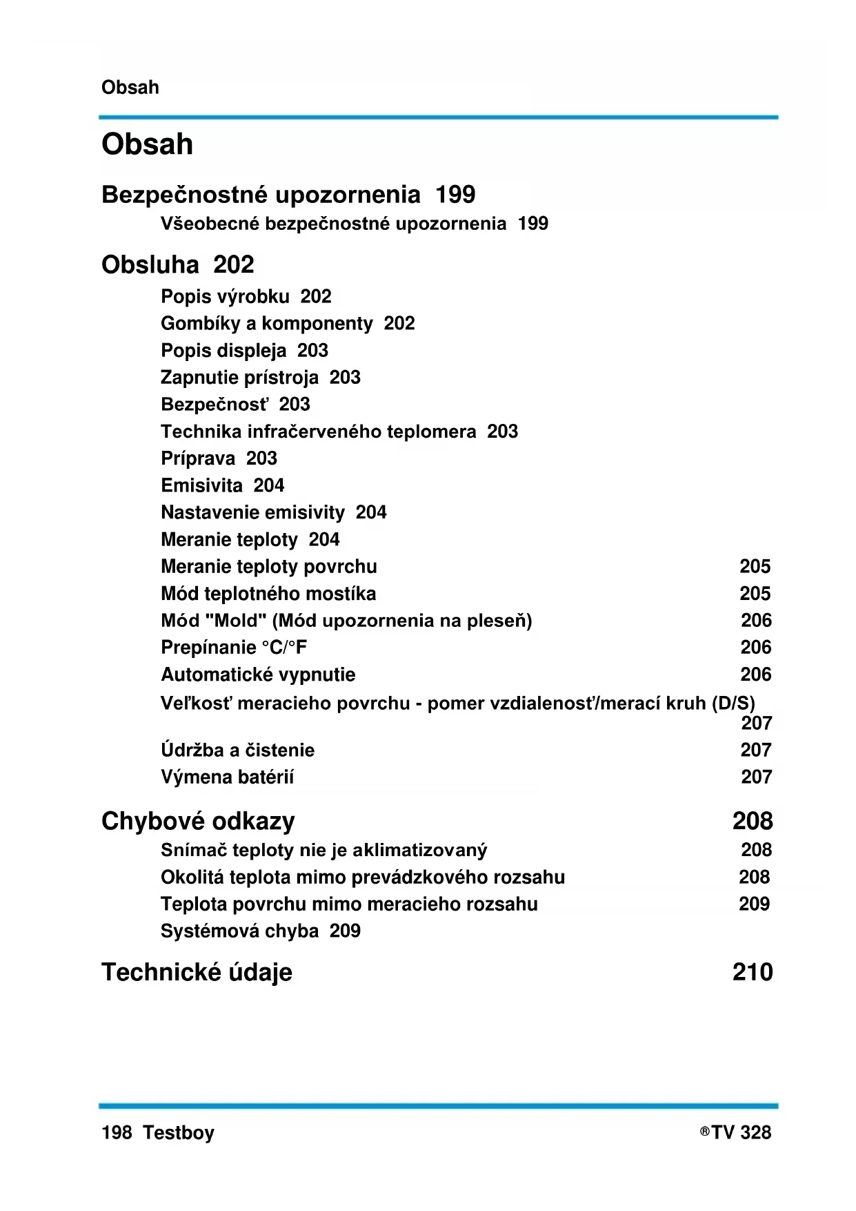 TV 328 209 SLOVENSKY Meranie v aktuálnom prostredí nie je možné. Teplota povrchu mimo meracieho rozsahu Teplota povrchu objektu v mieste merania je príliš vysoká alebo príliš nízka na meranie. Teplota tohto objektu sa nedá zmerať. Systémová chyba Prístroj narazil na systémovú chybu. Prístroj zresetujete tak, že vyberiete batériu, chvíľu počkáte, potom ju znovu vložte.Technické údaje 210 Testboy