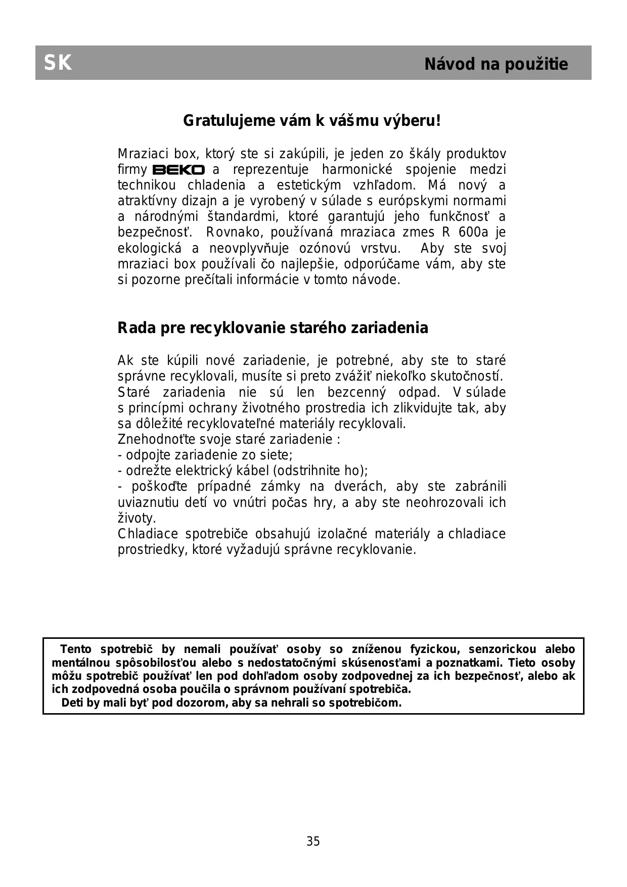 SK Návod na použitie Gratulujeme vám k vášmu výberu! Mraziaci box, ktorý ste si zakúpili, je jeden zo škály produktov firmy BEKO a reprezentuje harmonické spojenie medzi technikou chladenia a estetickým vzhľadom. Má nový a atraktívny dizajn a je vyrobený v súlade s európskymi normami a národnými štandardmi, ktoré garantujú jeho funkčnosť a bezpečnosť. Rovnako, používaná mraziaca zmes R 600a je ekologická a neovplyvňuje ozónovú vrstvu. Aby ste svoj mraziaci box používali čo najlepšie, odporúčame vám, aby ste si pozorne prečítali informácie v tomto návode.
