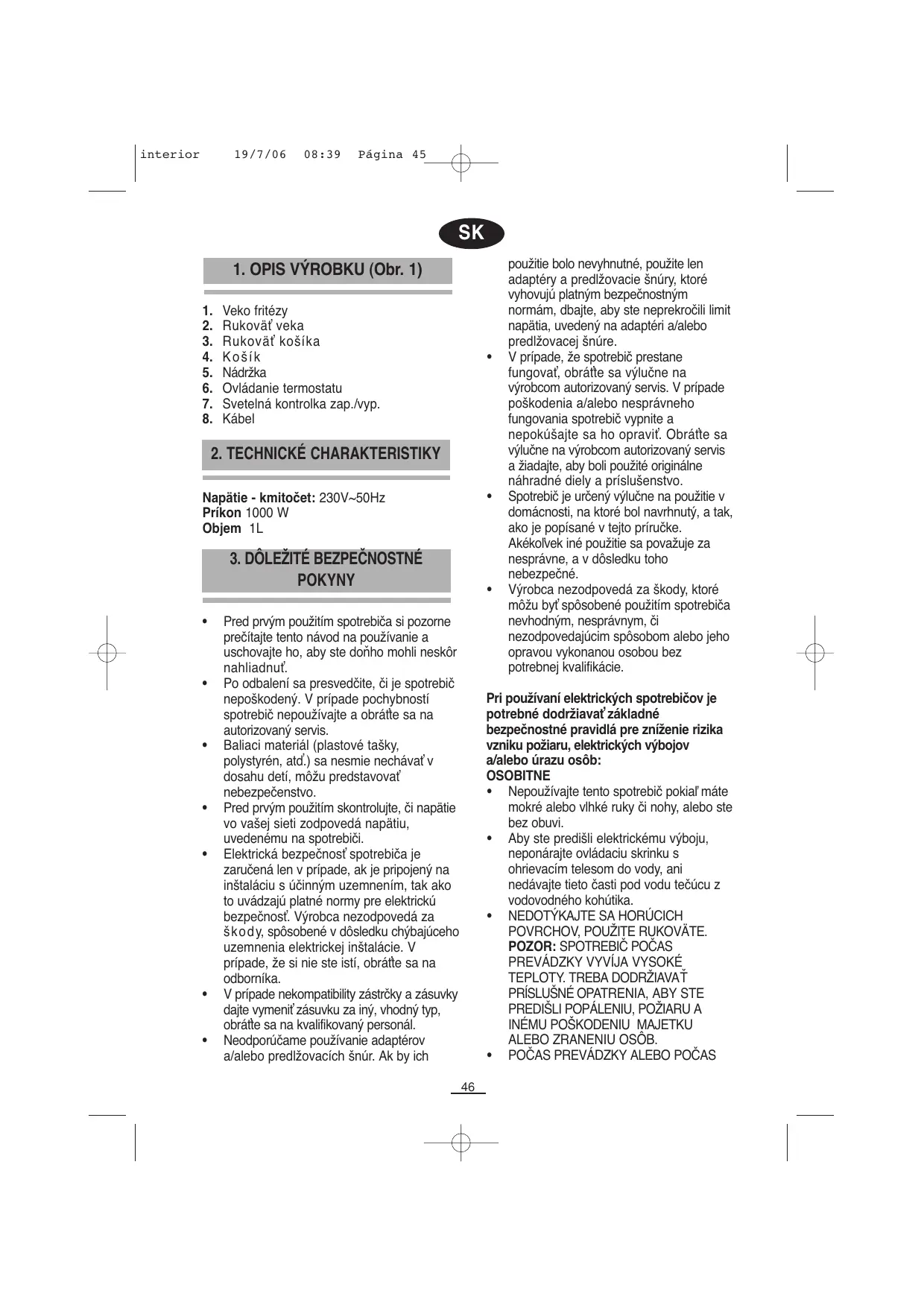 NEPREMIESTŇUJTE. Nezabúdajte, že olej sa môže skaziť alebo vzplanúť, ak sa zohrieva dlhodobo pri vysokých teplotách. V prípade, e by olej vzbĺkol, okamžite vypnite spotrebič a zakryte vekom, aby oheň v dôsledku nedostatku vzduchu zhasol. Na zahasenie ohňa nikdy nepoužívajte vodu. Odpojte spotrebič zo siete, keď ho nepoužívate, a pred akoukoľvek operáciou súvisiacou s jeho údržbou a čistením. Spotrebič odpojte tak, že najskôr uveďte vypínač do polohy "0", a následne ho odpojte zo siete. Nenechávajte zapnutý spotrebič bez dozoru. Ak sa vzdialite, vždy ho vypnite, i keď sa jedná len o krátky čas. Pred čistením a odložením spotrebiča nechajte olej vychladnúť. Nepoužívajte spotrebič ak je poškodený prívodný kábel alebo zástrčka, alebo v prípade poškodenia či nesprávneho fungovania. Pravidelne kontrolujte prívodný kábel, či nie je poškodený. Spotrebiteľ nesmie vymieňať prívodný kábel. V prípade, že je poškodený, alebo je potrebné ho vymeniť, obráťte sa výlučne na výrobcom autorizovaný servis, aby ho skontrolovali, opravili alebo upravili. Nenechávajte kábel visieť zo stola alebo kuchynskej pracovnej dosky, dbajte, aby sa kábel nedotýkal teplých povrchov. Pri odpojení zástrčky zo siete nikdy neťahajte za kábel. Neklaďte spotrebič na teplý plynový alebo elektrický sporák, do teplej rúry alebo mikrovlnnej rúry ani do ich blízkosti. Zapnutý spotrebič v prevádzke majte mimo dosahu detí a duševne chorých osôb. Nepoužívajte tento spotrebič vonku, ani ho nevystavujte atmosferickým vplyvom (dažďu, slnku, ľadu, a pod.) Keď sa rozhodnete viac spotrebič nepoužívať, je vhodné odpojiť ho zo siete a znefunkčniť ho napríklad odstrihnutím prívodného kábla.
