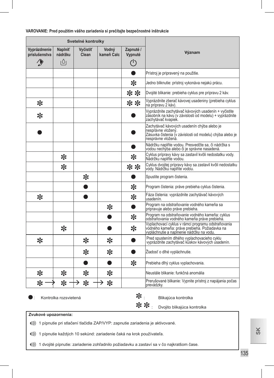 Vider le collecteur de marc (un cycle de 2 cafés est en cours). Vider le collecteur de marc + nettoyer le tiroir (suivant modèle) + vider le bac récolte-gouttes. Le collecteur de marc est absent ou mal positionné. Le tiroir de nettoyage (suivant modèle) est absent ou mal positionné. Remplir le réservoir d'eau. Le réservoir d'eau est absent ou mal positionné. Le cycle café a été interrompu par manque d'eau. Remplir le réservoir d'eau. Le cycle double café a été interrompu par manque d'eau. Remplir le réservoir. Programme de nettoyage demandé. Programme de nettoyage : cycle de nettoyage en cours. Phase de nettoyage : vider le bac à marc. Programme de détartrage demandé. Programme de détartrage : cycle de détartrage en cours. Cycles de rinçage du programme de détartrage : en cours. Demande de vider et de remplir le réservoir d'eau. Vider le bac à cake avant le lancement d'un rinçage long. Demande rinçage long. Rinçage long en cours. Clignotement Simultané : anomalie de fonctionnement. Clignotement voyant après voyant : mise en hors tension de l'appareil en cours. :