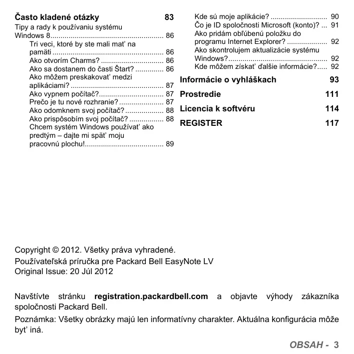 Copyright © 2012. Všetky práva vyhradené. Používateľská príručka pre Packard Bell EasyNote LV Original Issue: 20 Júl 2012 Navštívte stránku registration.packardbell.com spoločnosti Packard Bell.