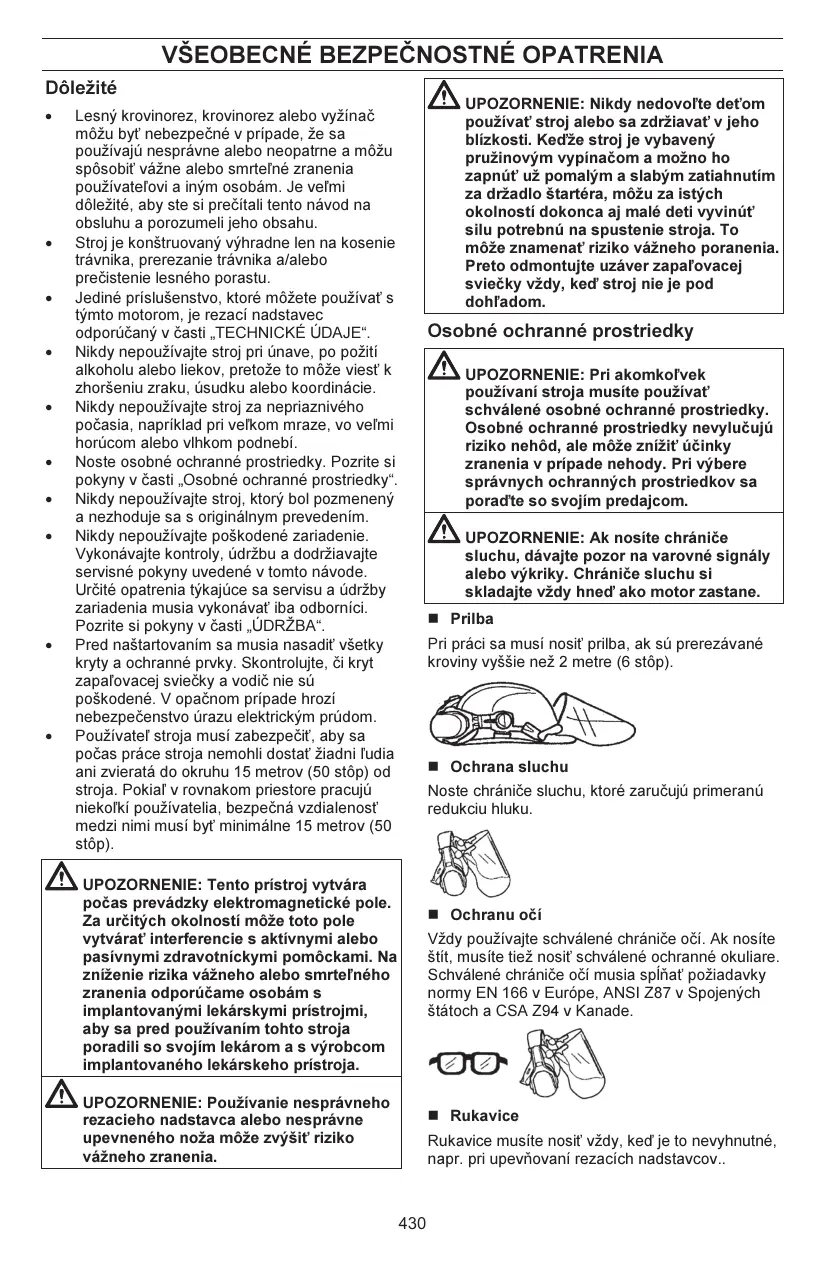 AVERTISSEMENT : Un équipement de protection personnelle homologué doit impérativement être utilisé lors de tout travail avec la machine. L’équipement de protection personnelle n’élimine pas les risques mais réduit la gravité des blessures en cas d’accident. Demander conseil au concessionnaire afin de choisir un équipement adéquat. AVERTISSEMENT : Soyez toujours attentifs aux signaux d’alerte ou aux appels lorsque vous portez des protecteurs d´oreilles. Enlevez toujours vos protecteurs d’oreilles dès que le moteur s’arrête. Casque Utilisez un casque si les broussailles à élaguer font plus de 2 mètres de haut.