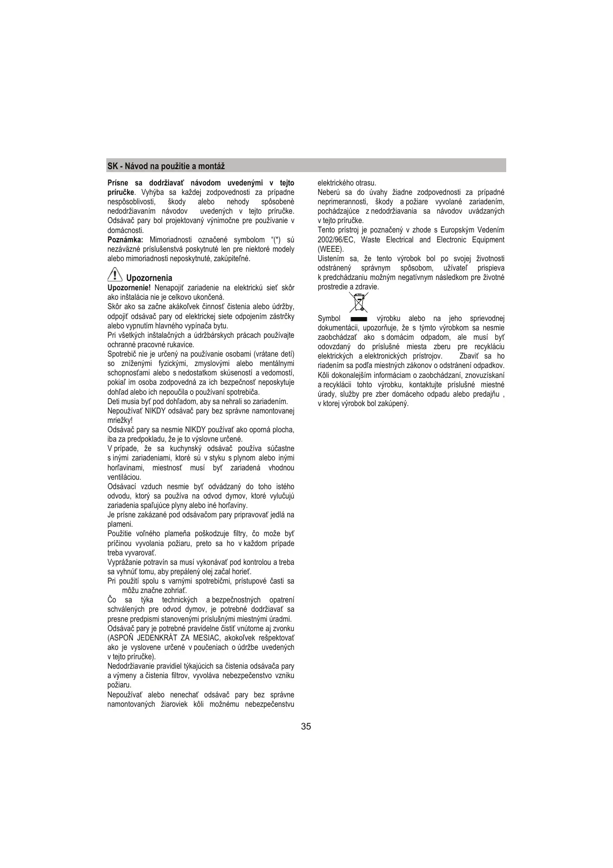 Attention! Ne pas raccorder l’appareil au circuit électrique avant que le montage ne soit complètement terminé. Avant toute opération de nettoyage ou d’entretien, débrancher la hotte du circuit électrique en retirant la prise ou en coupant l’interrupteur général de l’habitation. Munissez-vous de gants de travail avant d’effectuer toute opération d’installation et d’entretien. L’appareil n’est pas destiné à une utilisation par des enfants ou des personnes à capacités physiques, sensorielles ou mentales réduites et sans expérience et connaissance à moins qu’ils ne soient sous la supervision ou formés sur l’utilisation de l’appareil par une personne responsable de leur sécurité. Les enfants doivent être surveillés afin qu’ils ne jouent pas avec l’appareil. Ne jamais utiliser la hotte sans que la grille ne soit montée correctement! La hotte ne doit JAMAIS être utilisée comme plan pour déposer quelque chose sauf si cela est expressément indiqué. Quand la hotte est utilisée en même temps que d’autres appareils à combustion de gaz ou d’autres combustibles, le local doit disposer d’une ventilation suffisante. L’air aspiré ne doit jamais être envoyé dans un conduit utilisé pour l’évacuation des fumées produites par des appareils à combustion de gaz ou d’autres combustibles. Il est formellement interdit de faire flamber les aliments sous la hotte. L’utilisation de flammes libres peut entraîner des dégâts aux filtres et peut donner lieu à des incendies, il faut donc les éviter à tout prix. La friture d’aliments doit être réalisée sous contrôle pour éviter que l’huile surchauffée ne prenne feu. Les pièces accessibles peuvent se réchauffer de façon importante quand elles sont utilisées avec des appareils pour la cuisson. En ce qui concerne les mesures techniques et de sécurité à adopter pour l’évacuation des fumées, s’en tenir strictement à ce qui est prévu dans les règlements des autorités locales compétentes. La hotte doit être régulièrement nettoyée, aussi bien à l’intérieur qu’à l’extérieur (AU MOINS UNE FOIS PAR MOIS, respecter néanmoins les instructions relatives à l’entretien fournies dans ce manuel). La non observation de ces normes de nettoyage de la hotte et du changement et nettoyage des filtres comporte des risques