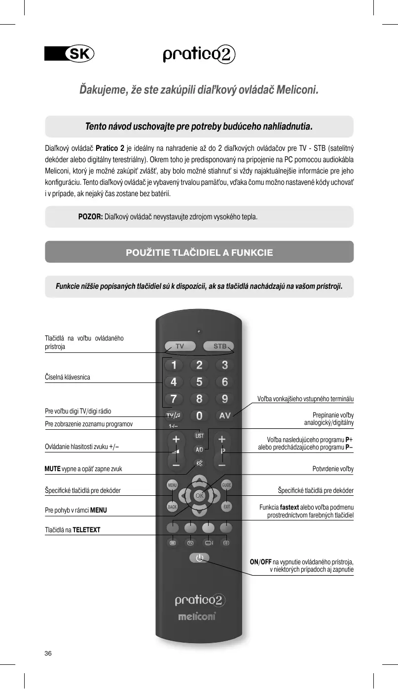Ďakujeme, že ste zakúpili diaľkový ovládač Meliconi. Tento návod uschovajte pre potreby budúceho nahliadnutia. Diaľkový ovládač Pratico 2 je ideálny na nahradenie až do 2 diaľkových ovládačov pre TV - STB (satelitný dekóder alebo digitálny terestriálny). Okrem toho je predisponovaný na pripojenie na PC pomocou audiokábla Meliconi, ktorý je možné zakúpiť zvlášť, aby bolo možné stiahnuť si vždy najaktuálnejšie informácie pre jeho konfiguráciu. Tento diaľkový ovládač je vybavený trvalou pamäťou, vďaka čomu možno nastavené kódy uchovať i v prípade, ak nejaký čas zostane bez batérií. POZOR: Diaľkový ovládač nevystavujte zdrojom vysokého tepla.