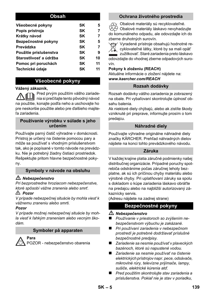 Všeobecné pokyny Vážený zákazník, Pred prvým použitím vášho zariadenia si prečítajte tento pôvodný návod na použitie, konajte podľa neho a uschovajte ho pre neskoršie použitie alebo pre ďalšieho majiteľa zariadenia. Používanie výrobku v súlade s jeho určením Symboly v návode na obsluhu Pri bezprostredne hroziacom nebezpečenstve, ktoré spôsobí vážne zranenia alebo smrť. 몇 Pozor V prípade nebezpečnej situácie by mohla viesť k vážnemu zraneniu alebo smrti. Pozor V prípade možnej nebezpečnej situácie by mohla viesť k ľahkým zraneniam alebo vecným škodám. Symboler på apparaten Para POZOR - nebezpečenstvo obarenia Rozsah dodávky Rozsah dodávky vášho zariadenia je zobrazený na obale. Pri vybaľovaní skontrolujte úplnosť obsahu balenia. Ak niektoré diely chýbajú, alebo ak zistíte škody vzniknuté pri preprave, informujte prosím o tom predajcu. Náhradné diely Používajte parný čistič výhradne v domácnosti. Prístroj je určený na čistenie pomocou pary a môže sa používať s vhodným príslušenstvom tak, ako je popísané v tomto návode na prevádzku. Nie je potrebný žiadny čistiaci prostriedok. Rešpektujte pritom hlavne bezpečnostné pokyny. Nebezpečenstvo Obalové materiály sú recyklovateľné. Obalové materiály láskavo nevyhadzujte do komunálneho odpadu, ale odovzdajte ich do zberne druhotných surovín. Vyradené prístroje obsahujú hodnotné recyklovateľné látky, ktoré by sa mali opät' zužitkovat'. Staré zariadenia preto láskavo odovzdajte do vhodnej zberne odpadových surovín. Pokyny k zloženiu (REACH) Aktuálne informácie o zložení nájdete na: www.kaercher.com/REACH Používajte výhradne originálne náhradné diely značky KÄRCHER. Prehľad náhradných dielov nájdete na konci tohto prevádzkového návodu. Záruka V každej krajine platia záručné podmienky našej distribučnej organizácie. Prípadné poruchy spotrebiča odstránime počas záručnej lehoty bezplatne, ak sú ich príčinou chyby materiálu alebo výrobné chyby. Pri uplatňovaní záruky sa spolu s dokladom o kúpe zariadenia láskavo obráťte na predajcu alebo na najbližší autorizovaný zákaznícky servis. (Adresu nájdete na zadnej strane) Bezpečnostné pokyny Nebezpečenstvo Používanie v priestoroch so zvýšením nebezpečenstvom výbuchu je zakázané. Pri používaní zariadenia v nebezpečnom prostredí je potrebné dodržiavať príslušné bezpečnostné predpisy. Zariadenie sa nesmie používať v plaveckých bazénoch, ktoré sú napustené vodou. Zariadenie sa nesmie používať na čistenie elektrických prístrojov napr. pece, odsávače, mikrovlné rúry, televízne prijímače, lampy, sušiče, elektrické kúrenia atď. Pred použitím skontrolujte stav zariadenia a príslušenstva. Pokiaľ nie je stav v poriadku, SK – 5