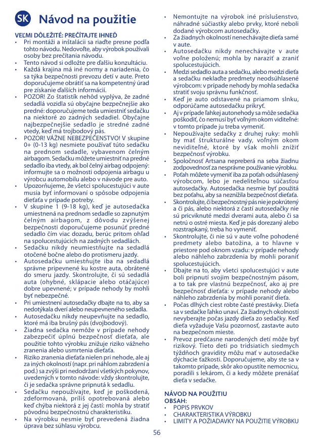 Como resultado de un accidente de cualquier tipo, la sillita podría haber sufrido daños no visibles. En ese caso es necesario reemplazarla. No utilice sillas de segunda mano. Su estructura podría haber sufrido daños no visibles que podrían comprometer la seguridad del producto. La sociedad ARTSANA no asume responsabilidad alguna por el uso inadecuado del producto. La funda sólo puede cambiarse por otra aprobada por el fabricante, ya que constituye parte integrante de la silla de auto. Para no comprometer la seguridad del niño, no utilizar nunca la silla de auto sin la funda. Compruebe que el cinturón de seguridad no esté retorcido y evite que el mismo o cualquier parte de la silla queden enganchados con la puerta, o bien que rocen contra puntas salientes. En caso de que el cinturón esté roto o desfilachado es necesario cambiarlo. Asegurarse de que no se transportan objetos sin fijarlos, sobre todo en la parte trasera: en caso de accidente o frenada brusca podrían golpear y herir a los pasajeros. Asegurarse de que todos los pasajeros del vehículo usen el cinturón de seguridad, por su propia seguridad, pero también porque durante el viaje podrían golpear al niño. Durante los viajes largos se aconseja realizar frecuentes paradas, el niño se cansa muy fácilmente. No sacar por ninguna razón al niño de la silla de auto mientras el vehículo esté en movimiento. Si el bebé necesita atenciones, es necesario detener el vehículo en un lugar seguro. Los recién nacidos prematuros con menos de 37 semanas de gestación pueden correr riesgo en la silla de auto, ya que pueden sufrir dificultades respiratorias mientras estén sentados en ella.