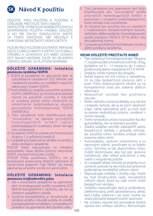 DÔLEŽITÉ OZNÁMENIE: Inštalácia pomocou systému ISOFIX 1. ISOFIX je zariadenie na upevnenie detí. Je odsúhlasené nariadením ECE R44/04 pre všeobecné použitie vo vozidlách majúcich zakotvujúci systém ISOFIX. 2. Pred inštaláciou sedačky a použitím systému ISOFIX UNIVERSALE je nevyhnutné prečítať návod na použitie vozidla. V návode je uvedený počet miest vhodných na umiestnenie zodpovedajúcej skupiny autosedačky homologovanej ISOFIX UNIVERSALE. 3. Toto zariadenie bolo klasifikované ako ”univerzálne” na základe prísnejších homologačných kritérií oproti predchádzajúcim modelom, ktoré nemajú toto oznámenie. 4. Zariadenie ISOFIX je určené pre hmotnostnú skupinu 1 a veľkostnú triedu B. 5. V prípade pochybností sa obráťte na výrobcu alebo predajcu zariadenia. POZOR! Nikdy nepoužívajte na inštaláciu autosedačky naraz obidva systémy zakotvenia: ISOFIX a bezpečnostný pás vozidla. POZOR! Počas používania ISOFIX-u nie je postačujúce pripevnenie dolných zakotvení. Je nevyhnutné pripevniť “Top Tether” do miesta zakotvenia určeného výrobcom automobilu. DÔLEŽITÉ OZNÁMENIE: Inštalácia pomocou trojbodového pásu 1. Ide o univerzálne zariadenie na upevnenie detí, homologované podľa nariadenia ECE R44/04 kompatibilné s väčšinou, ale nie so všetkými sedadlami vozidla. 2. Správna kompatibilita je dosiahnutá, ak výrobca vozidla v návode uvádza, že vozidlo je prispôsobené na inštaláciu “univerzálnych” zariadení na upevnenie detí daného veku.