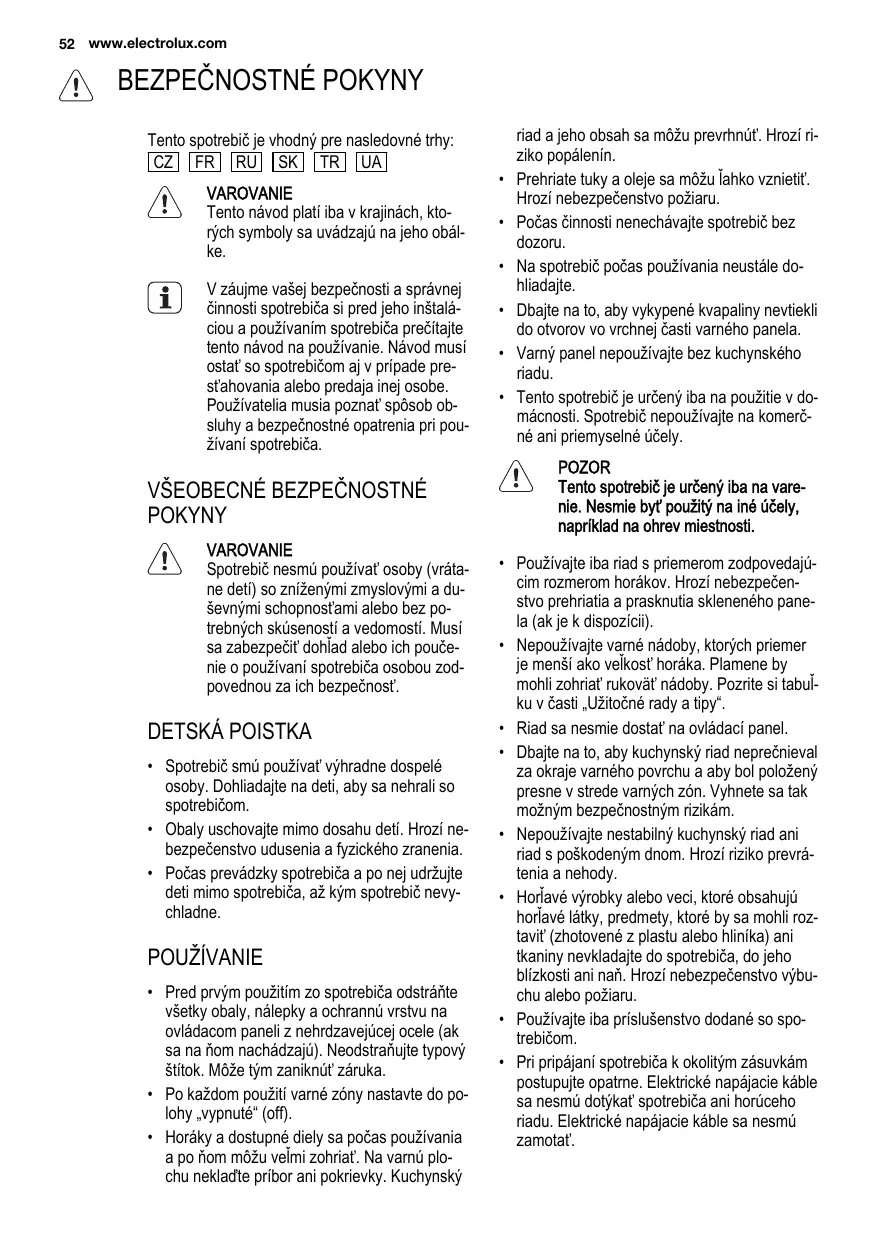 BEZPEČNOSTNÉ POKYNY Tento spotrebič je vhodný pre nasledovné trhy: CZ FR RU SK TR UA VAROVANIE Tento návod platí iba v krajinách, kto‐ rých symboly sa uvádzajú na jeho obál‐ ke. V záujme vašej bezpečnosti a správnej činnosti spotrebiča si pred jeho inštalá‐ ciou a používaním spotrebiča prečítajte tento návod na používanie. Návod musí ostať so spotrebičom aj v prípade pre‐ sťahovania alebo predaja inej osobe. Používatelia musia poznať spôsob ob‐ sluhy a bezpečnostné opatrenia pri pou‐ žívaní spotrebiča.