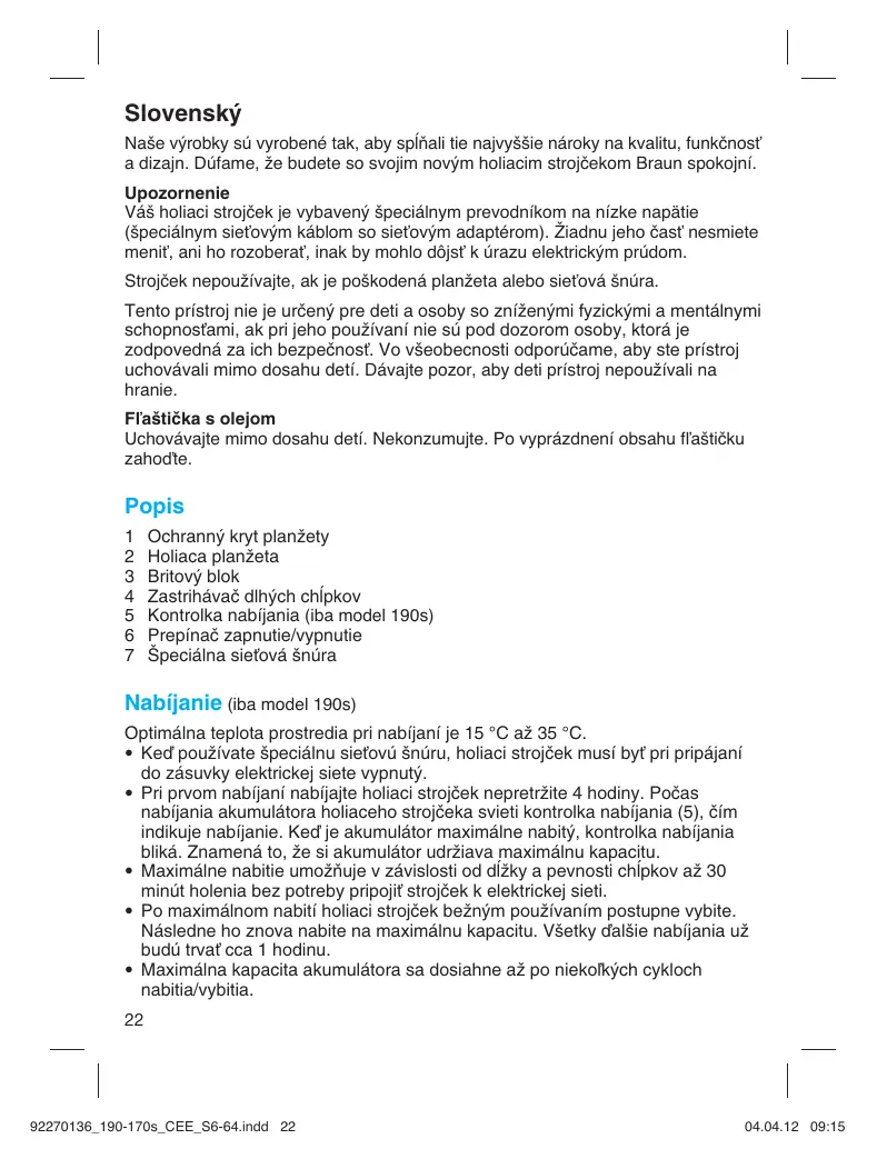 Slovensk˘ Naše výrobky sú vyrobené tak, aby spĺňali tie najvyššie nároky na kvalitu, funkčnosť a dizajn. Dúfame, že budete so svojim novým holiacim strojčekom Braun spokojní. Upozornenie Váš holiaci strojček je vybavený špeciálnym prevodníkom na nízke napätie (špeciálnym sieťovým káblom so sieťovým adaptérom). Žiadnu jeho časť nesmiete meniť, ani ho rozoberať, inak by mohlo dôjsť k úrazu elektrickým prúdom. Strojček nepoužívajte, ak je poškodená planžeta alebo sieťová šnúra. Tento prístroj nie je urãen˘ pre deti a osoby so zníÏen˘mi fyzick˘mi a mentálnymi schopnosÈami, ak pri jeho pouÏívaní nie sú pod dozorom osoby, ktorá je zodpovedná za ich bezpeãnosÈ. Vo v‰eobecnosti odporúãame, aby ste prístroj uchovávali mimo dosahu detí. Dávajte pozor, aby deti prístroj nepoužívali na hranie. Fľaštička s olejom Uchovávajte mimo dosahu detí. Nekonzumujte. Po vyprázdnení obsahu fľaštičku zahoďte. Popis