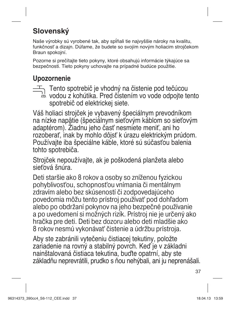 Slovenský Naše výrobky sú vyrobené tak, aby spĺňali tie najvyššie nároky na kvalitu, funkčnosť a dizajn. Dúfame, že budete so svojím novým holiacim strojčekom Braun spokojní. Pozorne si prečítajte tieto pokyny, ktoré obsahujú informácie týkajúce sa bezpečnosti. Tieto pokyny uchovajte na prípadné budúce použitie. Upozornenie Tento spotrebič je vhodný na čistenie pod tečúcou vodou z kohútika. Pred čistením vo vode odpojte tento spotrebič od elektrickej siete. Váš holiaci strojček je vybavený špeciálnym prevodníkom na nízke napätie (špeciálnym sieťovým káblom so sieťovým adaptérom). Žiadnu jeho časť nesmiete meniť, ani ho rozoberať, inak by mohlo dôjsť k úrazu elektrickým prúdom. Používajte iba špeciálne káble, ktoré sú súčasťou balenia tohto spotrebiča. Strojček nepoužívajte, ak je poškodená planžeta alebo sieťová šnúra. Deti staršie ako 8 rokov a osoby so zníženou fyzickou pohyblivosťou, schopnosťou vnímania či mentálnym zdravím alebo bez skúseností či zodpovedajúceho povedomia môžu tento prístroj používať pod dohľadom alebo po obdržaní pokynov na jeho bezpečné používanie a po uvedomení si možných rizík. Prístroj nie je určený ako hračka pre deti. Deti bez dozoru alebo deti mladšie ako 8 rokov nesmú vykonávať čistenie a údržbu prístroja. Aby ste zabránili vytečeniu čistiacej tekutiny, položte zariadenie na rovný a stabilný povrch. Keď je v základni nainštalovaná čistiaca tekutina, buďte opatrní, aby ste základňu neprevrátili, prudko s ňou nehýbali, ani ju neprenášali.