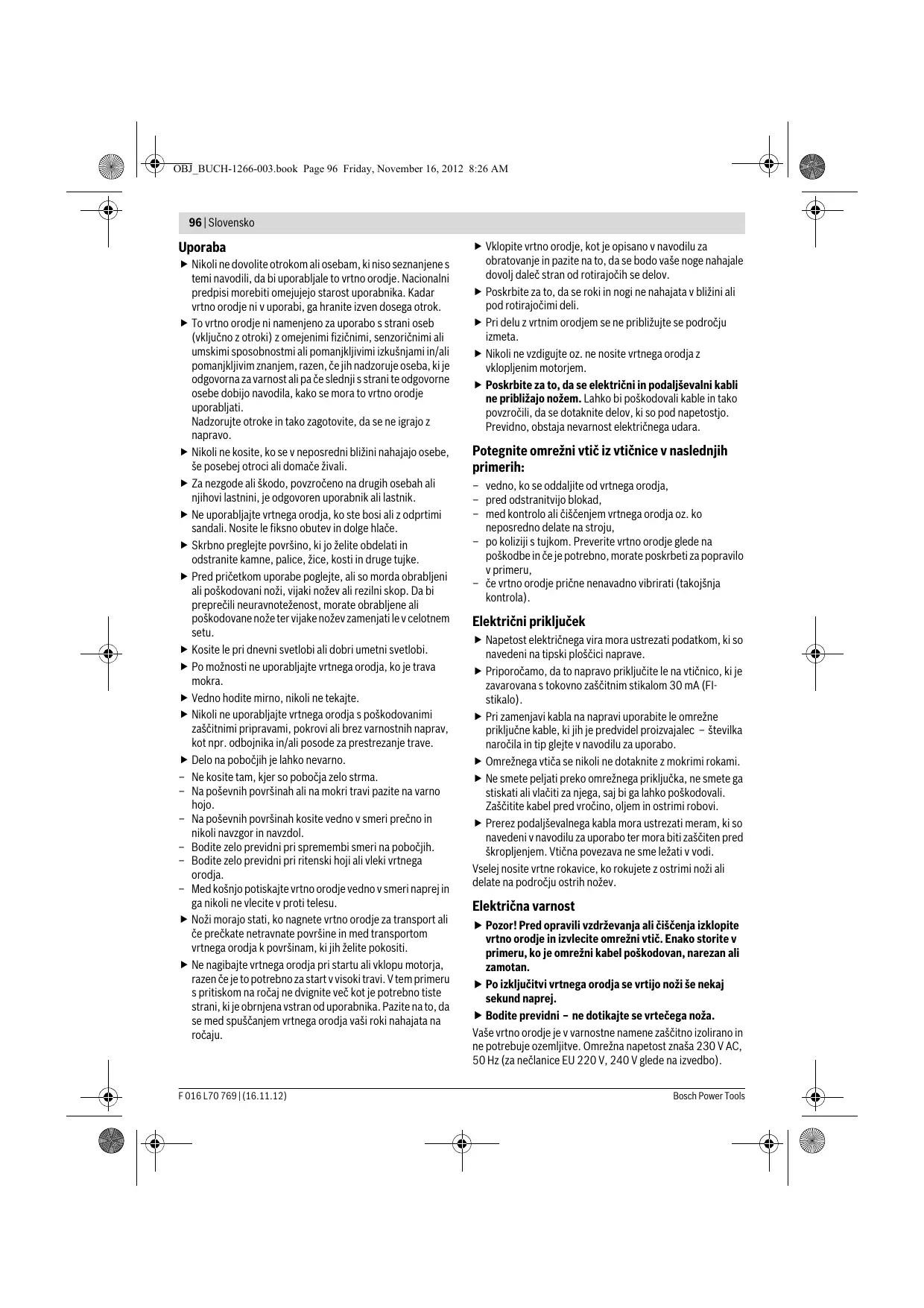 Traženje grešaka STOP Simptomi Motor ne kreće Mogući uzroci Nema mrežnog napona Neispravna mrežna utičnica Oštećen produžni kabl Osigurač je izbio Moguće je začepljenje Motorna zaštita je reagovala Baštenski uredjaj radi sa prekidima F 016 L70 769 | (16.11.12) Pomoć Prokontrolisati i uključiti Koristite drugu utičnicu Ispitajte i zamenite kabl ako je oštećen Promeniti osigurač Ispitajte donju stranu baštenskog uredjaja i u datom slučaju je oslobodite (uvek nosite zaštitne rukavice za rad u bašti) Motor ostaviti da se ohladi i podesiti veću visinu košenja Podesiti veću visinu košenja Visina sečenja za momentalne uslove je preniska Oštećen produžni kabl Ispitajte i zamenite kabl ako je oštećen Interni kablovi baštenskog uredjaja su u kvaru Potražiti ovlašćeni servis Motorna zaštita je reagovala Motor ostaviti da se ohladi i podesiti veću visinu košenja Bosch Power Tools OBJ_BUCH-1266-003.book Page 95 Friday, November 16, 2012 8:26 AM Slovensko | 95 Simptomi Baštenski uredjaj ostavlja iza neurednu sliku sečenja I/ili Motor radi teško Mogući uzroci Visina košenja je preniska Nož je tup Moguće je začepljenje Nož je okolo pogrešno montiran Posle uključivanja baštenskog Nožu smeta trava uredjaja ne okreće se nož Jake vibracije/šumovi Odpušteni navrtka/zavrtanj noža Odpušteni navrtka/zavrtanj noža Nož je oštećen Servisna služba i savetovanje o upotrebi www.bosch-garden.com Molimo navedie kod svih pitanja i naručivanje rezervnih delova neizostavno broj predmeta sa 10 mesta prema tipskoj tablici baštenskog uredjaja. Srpski Bosch-Service Dimitrija Tucovića 59 11000 Beograd Tel.: (011) 2448546 Fax: (011) 2416293 E-Mail: asboschz@EUnet.yu Uklanjanje djubreta Ne bacajte baštenski uredjaj u kućno djubre! Samo za EU-zemlje: Prema evropskoj smernici 2002/96/EG o starim električnim i elektronskim uredjajima i njijhovom pretvaranju u nacionalno dobro ne moraju više neupotrebljivi električni i elektronski uredjaji da se odvojeno sakupljaju i odvoze reciklaži koja odgovara zaštiti čovekove sredine. Zadržavamo pravo na promene. Pomoć Podesiti veću visinu košenja Promena noža Ispitajte donju stranu baštenskog uredjaja i u datom slučaju je oslobodite (uvek nosite zaštitne rukavice za rad u bašti) Nož montirati okolo ispravno Isključiti baštenski uredjaj Otkloniti začepljenje (uvek nosite zaštitne rukavice za rad u bašti) Steći navrtku/zavrtanj noža (17 Nm) Steći navrtku/zavrtanj noža (17 Nm) Promena noža Razlaga slikovnih simbolov Splošno opozorilo na nevarnost. Preberite si to navodilo za obratovanje. Pazite, da predmeti, ki bi odleteli od škarij, ne bodo poškodovali oseb, ki stojijo v bližini. Opozorilo: Ko vrtno orodje obratuje, držite varno razdaljo do slednjega. Pozor: Previdno – ne dotikajte se rotirajočih nožev. Nožje so ostri. Pazite na to, da ne boste izgubili prste na nogah in rokah. Preden želite opraviti nastavitve na stroju ali pa ga občistiti ali če se je zamotal kabel oziroma, če morate vrtno orodje za kratek čas pustiti brez nadozora, morate izklopiti vrtno orodje in potegniti omrežni vtič iz vtičnice. Poskrbite za to, da bo električni kabel oddaljen od rezalnih nožev. Počakajte na to, da se vsi deli vrtnega orodja popolnoma ustavijo, preden se je dotaknete. Noži po izklopu vrtnega orodja nadaljujejo z rotiranjem in lahko povzročijo poškodbe. Slovensko Vrtnega orodja ne uporabljajte, ko dežuje in ga ne izpostavljajte dežju. Varnostna navodila Zaščitite se pred električnim udarom. Pozor! Skrbno si preberite naslednja navodila. Seznanite se z upravljalnimi elementi in s pravilno uporabo vrtnega orodja. Prosimo, da to navodilo za obratovanje varno shranite za kasnejšo uporabo. Poskrbite za to, da bo priključni kabel oddaljen od rezalnih nožev. Bosch Power Tools F 016 L70 769 | (16.11.12) OBJ_BUCH-1266-003.book Page 96 Friday, November 16, 2012 8:26 AM 96 | Slovensko Uporaba Nikoli ne dovolite otrokom ali osebam, ki niso seznanjene s temi navodili, da bi uporabljale to vrtno orodje. Nacionalni predpisi morebiti omejujejo starost uporabnika. Kadar vrtno orodje ni v uporabi, ga hranite izven dosega otrok. To vrtno orodje ni namenjeno za uporabo s strani oseb (vključno z otroki) z omejenimi fizičnimi, senzoričnimi ali umskimi sposobnostmi ali pomanjkljivimi izkušnjami in/ali pomanjkljivim znanjem, razen, če jih nadzoruje oseba, ki je odgovorna za varnost ali pa če slednji s strani te odgovorne osebe dobijo navodila, kako se mora to vrtno orodje uporabljati. Nadzorujte otroke in tako zagotovite, da se ne igrajo z napravo. Nikoli ne kosite, ko se v neposredni bližini nahajajo osebe, še posebej otroci ali domače živali. Za nezgode ali škodo, povzročeno na drugih osebah ali njihovi lastnini, je odgovoren uporabnik ali lastnik. Ne uporabljajte vrtnega orodja, ko ste bosi ali z odprtimi sandali. Nosite le fiksno obutev in dolge hlače. Skrbno preglejte površino, ki jo želite obdelati in odstranite kamne, palice, žice, kosti in druge tujke. Pred pričetkom uporabe poglejte, ali so morda obrabljeni ali poškodovani noži, vijaki nožev ali rezilni skop. Da bi preprečili neuravnoteženost, morate obrabljene ali poškodovane nože ter vijake nožev zamenjati le v celotnem setu. Kosite le pri dnevni svetlobi ali dobri umetni svetlobi. Po možnosti ne uporabljajte vrtnega orodja, ko je trava mokra. Vedno hodite mirno, nikoli ne tekajte. Nikoli ne uporabljajte vrtnega orodja s poškodovanimi zaščitnimi pripravami, pokrovi ali brez varnostnih naprav, kot npr. odbojnika in/ali posode za prestrezanje trave. Delo na pobočjih je lahko nevarno. – Ne kosite tam, kjer so pobočja zelo strma. – Na poševnih površinah ali na mokri travi pazite na varno hojo. – Na poševnih površinah kosite vedno v smeri prečno in nikoli navzgor in navzdol. – Bodite zelo previdni pri spremembi smeri na pobočjih. – Bodite zelo previdni pri ritenski hoji ali vleki vrtnega orodja. – M