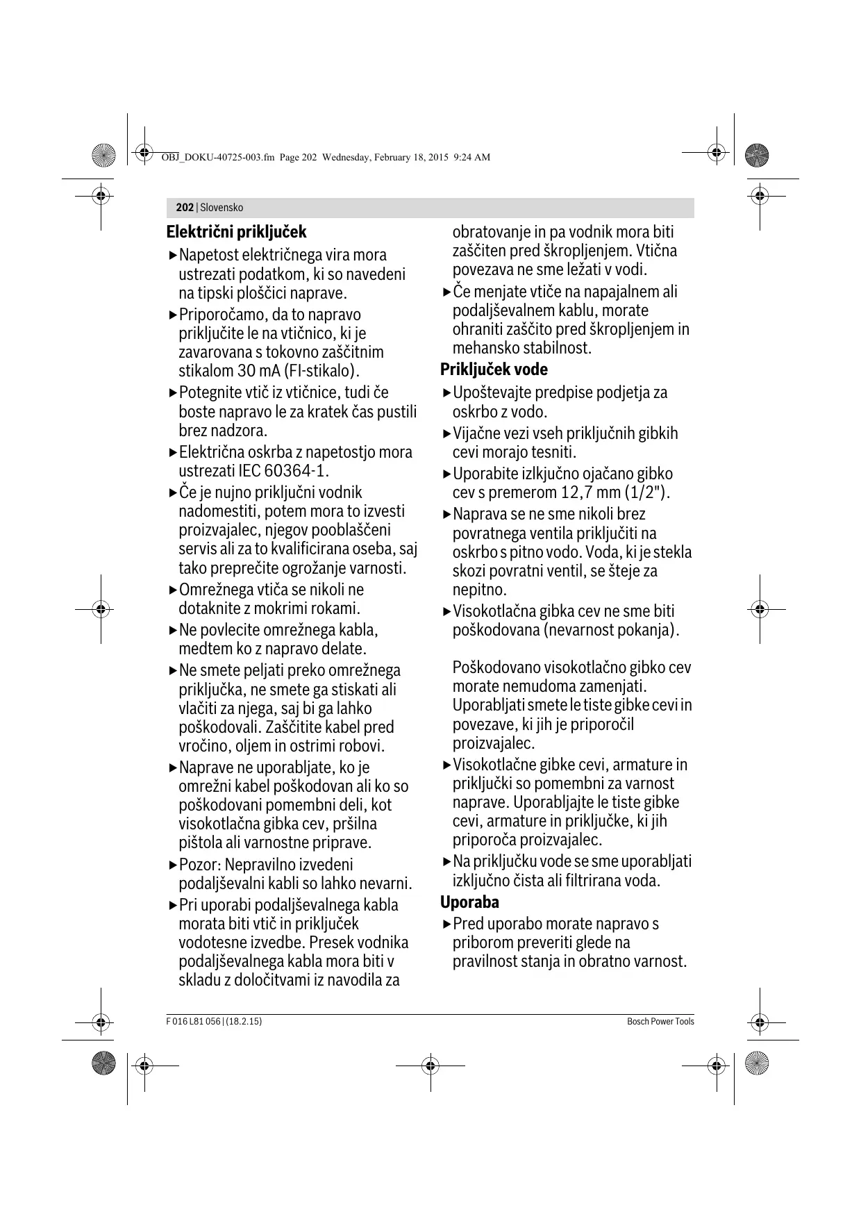 Nizki tlak Visok tlak Pribor Uporaba v skladu z namenom Naprava je namenjena za čiščenje površin in objektov v zunanjem področju, za naprave, vozila in ladje, v kolikor se uporablja ustrezen pribor, npr. sproščena čistilna sredstva. Namenska uporaba se nanaša na temperaturo okolice med 0 °C in 40 °C. Ta izdelek ni primeren za profesionalno uporabo. Bosch Power Tools OBJ_DOKU-40725-003.fm Page 205 Wednesday, February 18, 2015 9:24 AM Slovensko | 205 Tehnični podatki Visokotlačni čistilec Številka artikla Nazivno vsrkavanje Temperatura dotoka maks. Količina vode min. Dopustni tlak Nazivni tlak Pretok Maksimalni vhodni tlak Funkcija avtomatskega izklopa Teža po EPTA-Procedure 01/2003 Zaščitni razred Serijska številka