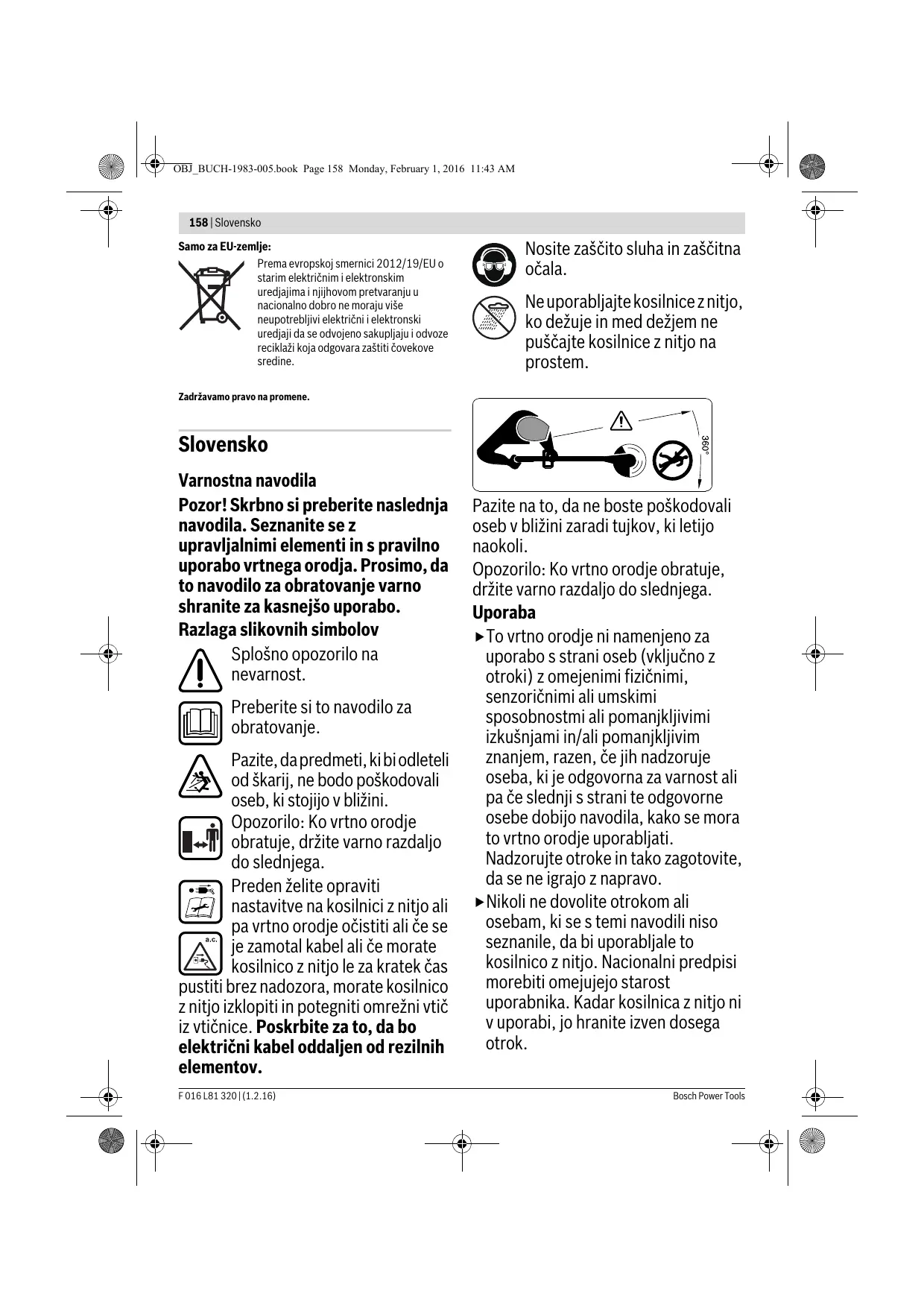 Montaža in obratovanje Ko je zaščitni pokrov montiran, ga ne smete več demontirati. Ne priključite vrtnega orodja na vtičnico, dokler ni v celoti sestavljen. Po izklopu kosilnice z nitko, rezilna nitka še nekaj sekund teče naprej. Počakajte, da se motor/rezilna nitka zaustavita, preden ponovno vklopite kosilnico z nitjo. Zaporedni izklopi in ponovni vklopi škarij v kratkih razmakih niso dovoljeni. F 016 L81 320 | (1.2.16) dB(A)