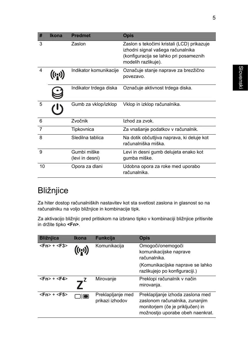 | +Fn> + <F5> | ☐ | Preklapljanje med prikazi izhodov | Preklapljanje izhoda zaslona med zaslonom računalnika, zunanjim monitorjem (će je priključen) in:noznostjo uporabe obeh naenkrat. |