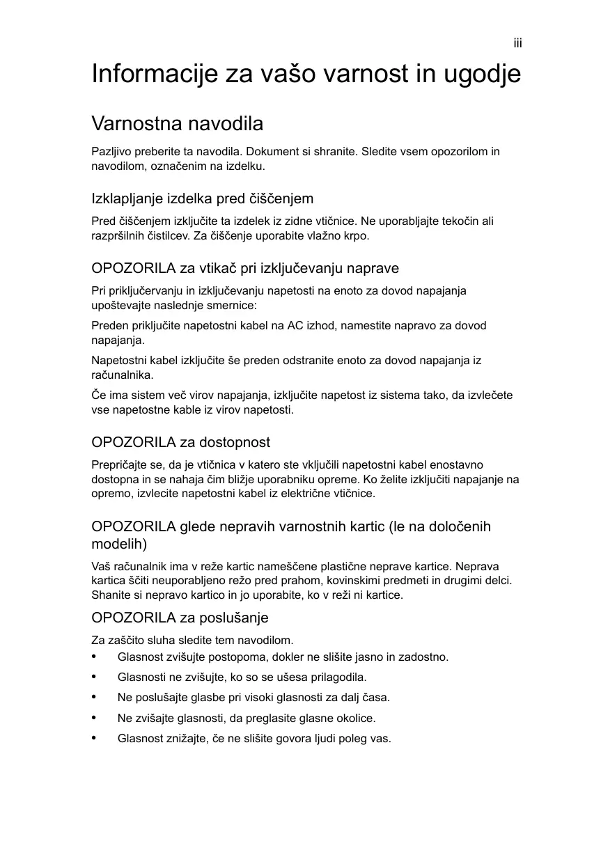 računalnik ne deluje normalno. prosimo glejte "Najpogosteje postavljena vprašanja" na strani 41. xvi iii Varnostna navodila Opozorilo o opticnem pogonu (le na določenih modelih) Delovno okolje Medicinske naprave Vozila Potencialno eksplozivna okolja Klici v sili Navodila za odstranitev Nasveti za živo srebro ENERGY STAR Napotki in informacije za udobno uporabo Prvo kot prvo iii vii viii viii