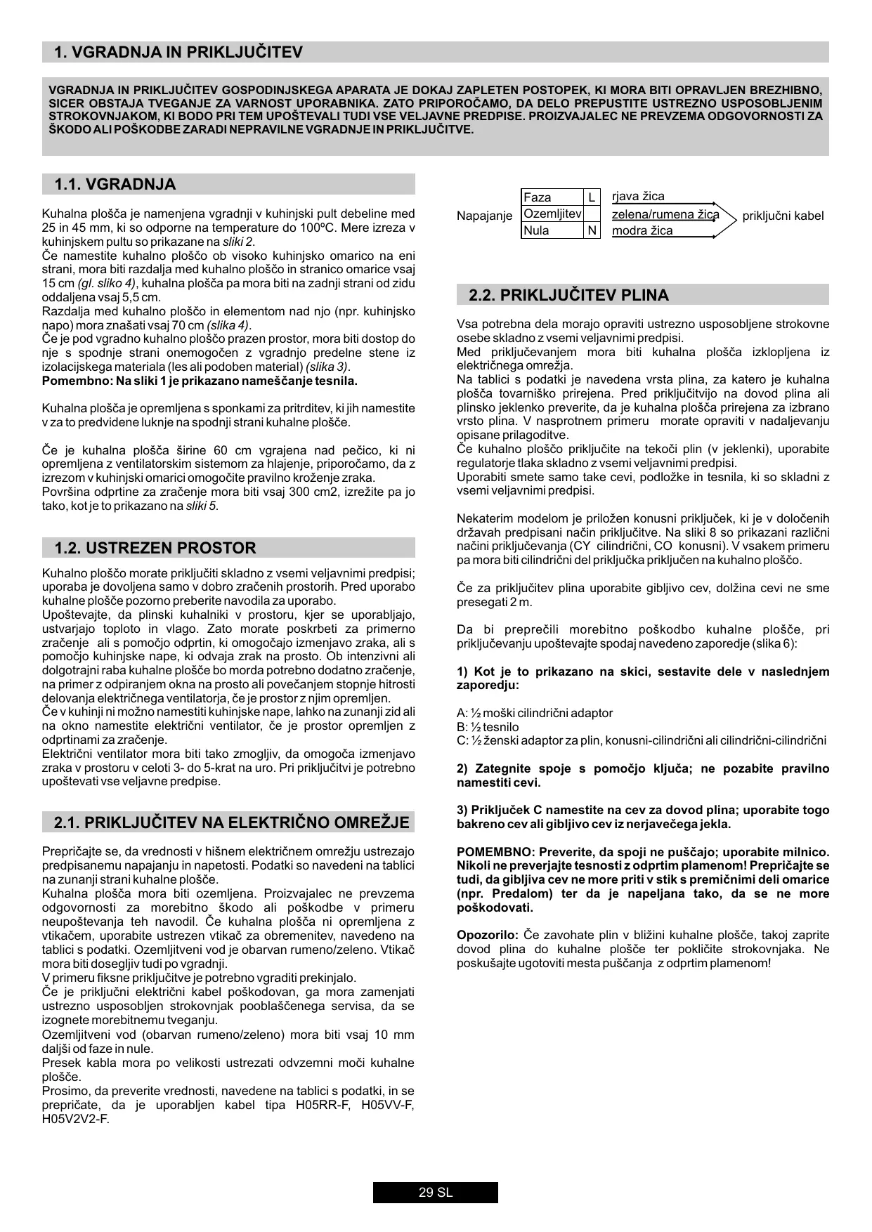 zaporedju: A: ½ moški cilindrični adaptor B: ½ tesnilo C: ½ ženski adaptor za plin, konusni-cilindrični ali cilindrični-cilindrični Prepričajte se, da vrednosti v hišnem električnem omrežju ustrezajo predpisanemu napajanju in napetosti. Podatki so navedeni na tablici na zunanji strani kuhalne plošče. Kuhalna plošča mora biti ozemljena. Proizvajalec ne prevzema odgovornosti za morebitno škodo ali poškodbe v primeru neupoštevanja teh navodil. Če kuhalna plošča ni opremljena z vtikačem, uporabite ustrezen vtikač za obremenitev, navedeno na tablici s podatki. Ozemljitveni vod je obarvan rumeno/zeleno. Vtikač mora biti dosegljiv tudi po vgradnji. V primeru fiksne priključitve je potrebno vgraditi prekinjalo. Če je priključni električni kabel poškodovan, ga mora zamenjati ustrezno usposobljen strokovnjak pooblaščenega servisa, da se izognete morebitnemu tveganju. Ozemljitveni vod (obarvan rumeno/zeleno) mora biti vsaj 10 mm daljši od faze in nule. Presek kabla mora po velikosti ustrezati odvzemni moči kuhalne plošče. Prosimo, da preverite vrednosti, navedene na tablici s podatki, in se prepričate, da je uporabljen kabel tipa H05RR-F, H05VV-F, H05V2V2-F. POMEMBNO: Preverite, da spoji ne puščajo; uporabite milnico. Nikoli ne preverjajte tesnosti z odprtim plamenom! Prepričajte se tudi, da gibljiva cev ne more priti v stik s premičnimi deli omarice (npr. Predalom) ter da je napeljana tako, da se ne more poškodovati. Opozorilo: Če zavohate plin v bližini kuhalne plošče, takoj zaprite dovod plina do kuhalne plošče ter pokličite strokovnjaka. Ne poskušajte ugotoviti mesta puščanja z odprtim plamenom! 29 SL Če uporabite manjšo posodo, zmanjšajte plamen, tako da ne sega izpod dna posode. Ne uporabljajte posodo s konkavnim ali konveksnim dnom.