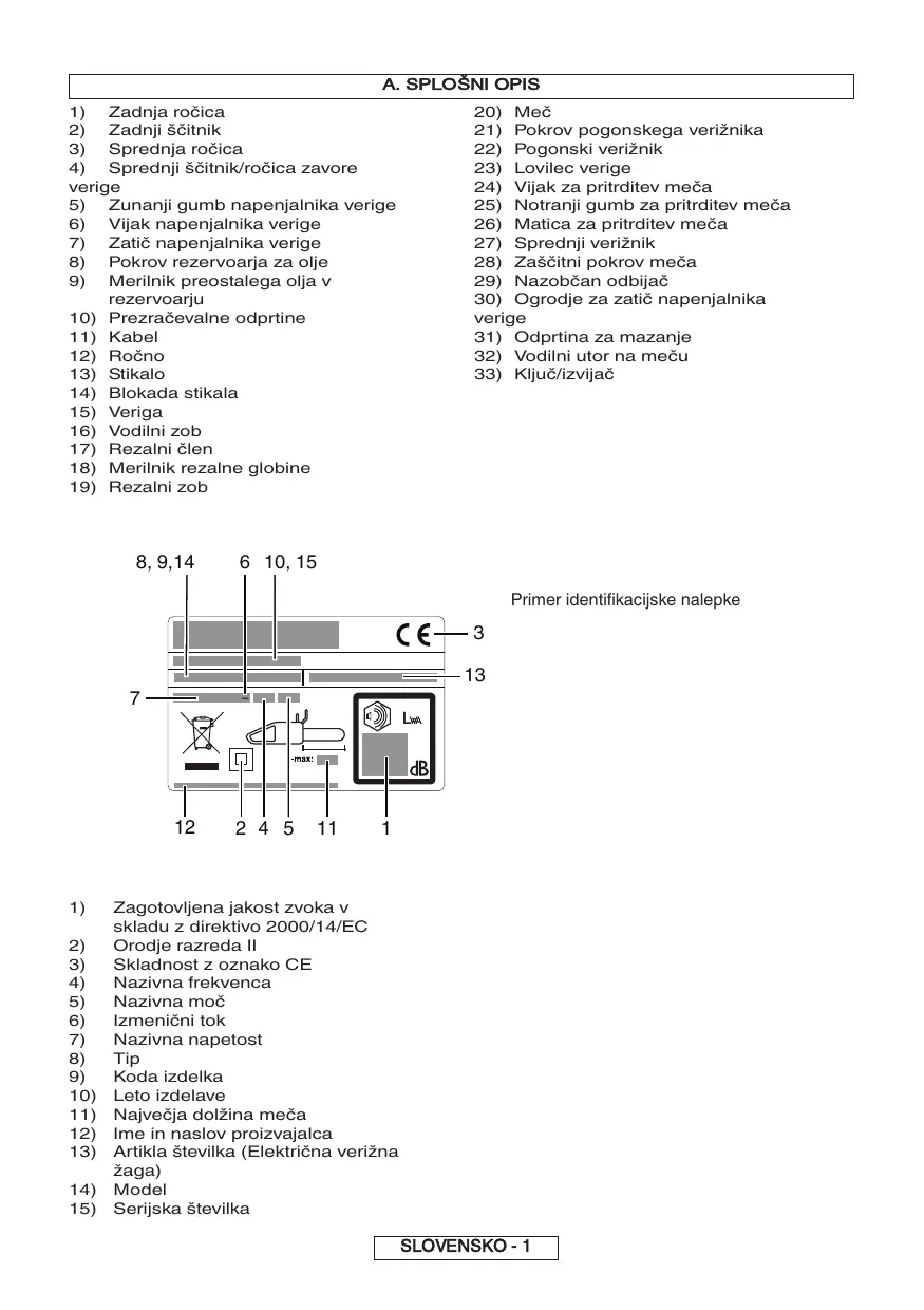 Zagotovljena jakost zvoka v skladu z direktivo 2000/14/EC Orodje razreda II Skladnost z oznako CE Nazivna frekvenca Nazivna moč Izmenični tok Nazivna napetost Tip Koda izdelka Leto izdelave Največja dolžina meča Ime in naslov proizvajalca Artikla številka (Električna verižna žaga) Model Serijska številka SLOVENSKO - 1