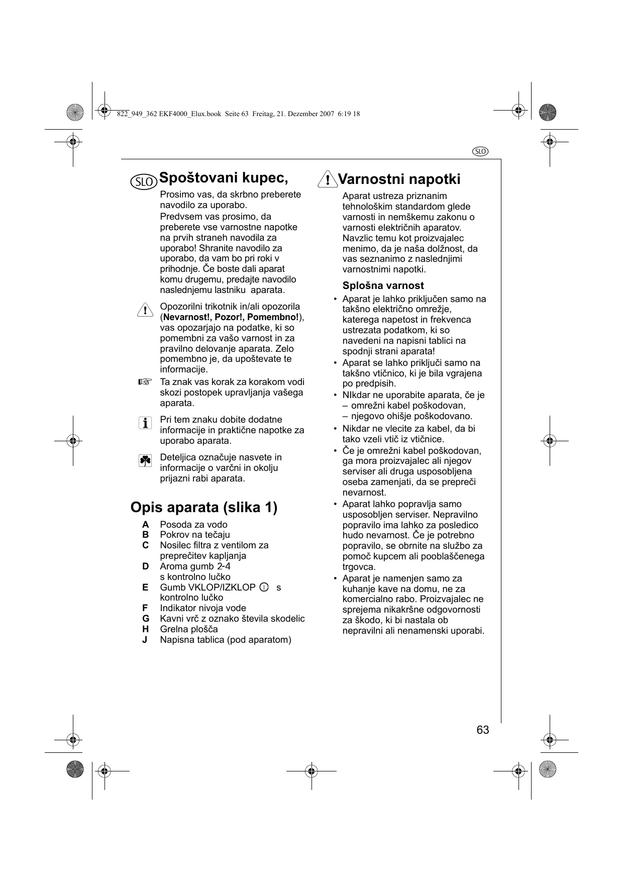 Prosimo vas, da skrbno preberete navodilo za uporabo. Predvsem vas prosimo, da preberete vse varnostne napotke na prvih straneh navodila za uporabol! Shranite navodilo za uporabo, da vam bo pri roki v prihodnje. Ge boste dali aparat komu drugemu, predajte navodilo naslednjemu lastniku aparata. Opozorilni trikotnik in/ali opozorila (Nevarnost!, Pozor!, Pomembnol), vas opozarjajo na podatke, ki so pomembni za vaëo varnost in za pravilno delovanje aparata. Zelo pomembno je, da upoëtevate te informacije. Ta znak vas korak za korakom vodi skozi postopek upravijanja vasega aparata. Pri tem znaku dobite dodatne informacije in praktiëne napotke za uporabo aparata. Deteljica oznaëuje nasvete in informacije o varëni in okolju prijazni rabi aparata. Opis aparata (slika 1) SION M O©O Owx> Posoda za vodo Pokrov na tetaju Nosilec filtra z ventilom za prepreëitev kapljanja Aroma gumb 2-4 s kontrolno luëko Gumb VKLOP/IZKLOP © s kontrolno luëko Indikator nivoja vode Kavni vré z oznako ëtevila skodelic Grelna plosèa Napisna tablica (pod aparatom) A\Varnostni napotki Aparat ustreza priznanim tehnoloëkim standardom glede varnosti in nemëkemu zakonu o varnosti elektriënih aparatov. Navzlic temu kot proizvajalec menimo, da je naëa dolznost, da vas seznanimo z naslednjimi varnostnimi napotki. Sploëna varnost Aparat je lahko prikljuëen samo na takëno elektriëno omrezje, katerega napetost in frekvenca ustrezata podatkom, ki so navedeni na napisni tablici na spodnji strani aparata! Aparat se lahko prikljuëi samo na takëno vtiénico, ki je bila vgrajena po predpisih. Nikdar ne uporabite aparata, ëe je — omreZni kabel poëkodovan, — njegovo ohiSje poSëkodovano. Nikdar ne vlecite za kabel, da bi tako vzeli vtié iz vtiénice. Êe je omrezni kabel poëkodovan, ga mora proizvajalec ali njegov serviser ali druga usposobljena oseba zamenjati, da se prepreëi nevarnost. Aparat lahko popravlja samo usposobljen serviser. Nepravilno popravilo ima lahko za posledico hudo nevarnost. Ce je potrebno popravilo, se obrnite na sluZbo za pomoë kupcem ali pooblasèenega trgovca. Aparat je namenjen samo za kuhanje kave na domu, ne za komercialno rabo. Proizvajalec ne sprejema nikakrëne odgovornosti za $kodo, ki bi nastala ob nepravilni ali nenamenski uporabi.