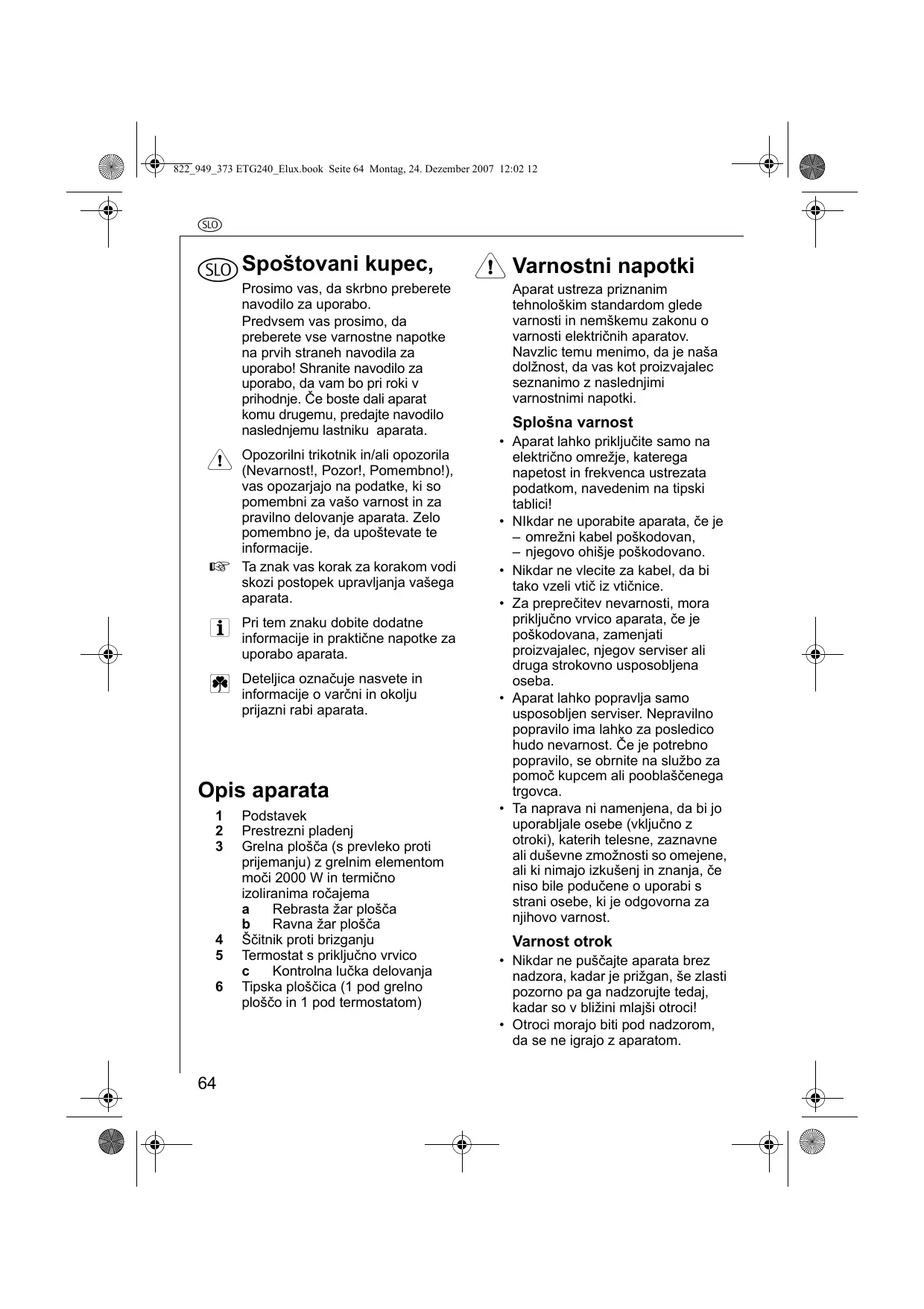 - Otroci morajo biti pod nadzorom, da se ne igrajo z aparatom. 822_949_373 ETG240_Elux.book Seite 65 Montag, 24. Dezember 2007 12:02 12