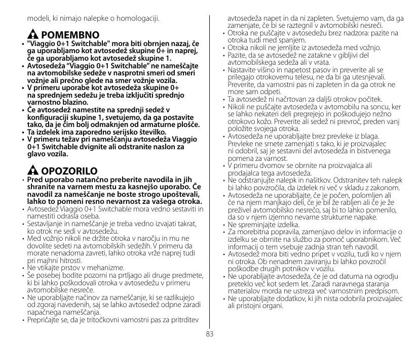 • Pred uporabo natančno preberite navodila in jih shranite na varnem mestu za kasnejšo uporabo. Če navodil za nameščanje ne boste strogo upoštevali, lahko to pomeni resno nevarnost za vašega otroka. • Avtosedež Viaggio 0+1 Switchable mora vedno sestaviti in namestiti odrasla oseba. • Sestavljanje in nameščanje je treba vedno izvajati takrat, ko otrok ne sedi v avtosedežu. • Med vožnjo nikoli ne držite otroka v naročju in mu ne dovolite sedeti na avtomobilskih sedežih. V primeru da morate nenadoma zavreti, lahko otroka vrže naprej tudi pri majhni hitrosti. • Ne vtikajte prstov v mehanizme. • Še posebej bodite pozorni na prtljago ali druge predmete, ki bi lahko poškodovali otroka v avtosedežu v primeru avtomobilske nesreče. • Ne uporabljajte načinov za nameščanje, ki se razlikujejo od zgoraj navedenih, saj se lahko avtosedež odpne zaradi napačnega nameščanja. • Prepričajte se, da je tritočkovni varnostni pas za pritrditev