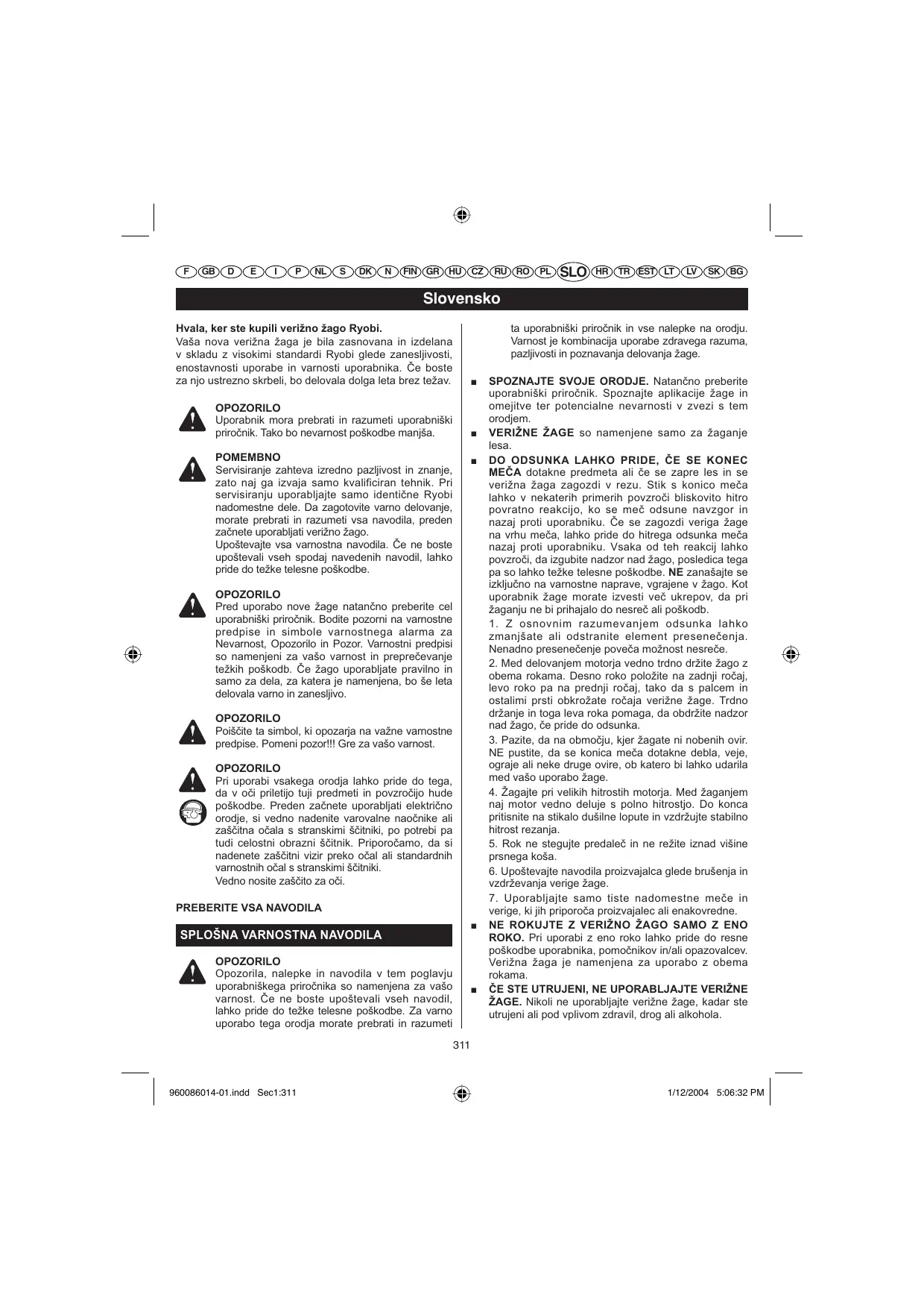 Slovensko Hvala, ker ste kupili verižno žago Ryobi. Vaša nova verižna žaga je bila zasnovana in izdelana v skladu z visokimi standardi Ryobi glede zanesljivosti, enostavnosti uporabe in varnosti uporabnika. Če boste za njo ustrezno skrbeli, bo delovala dolga leta brez težav. ta uporabniški priročnik in vse nalepke na orodju. Varnost je kombinacija uporabe zdravega razuma, pazljivosti in poznavanja delovanja žage.