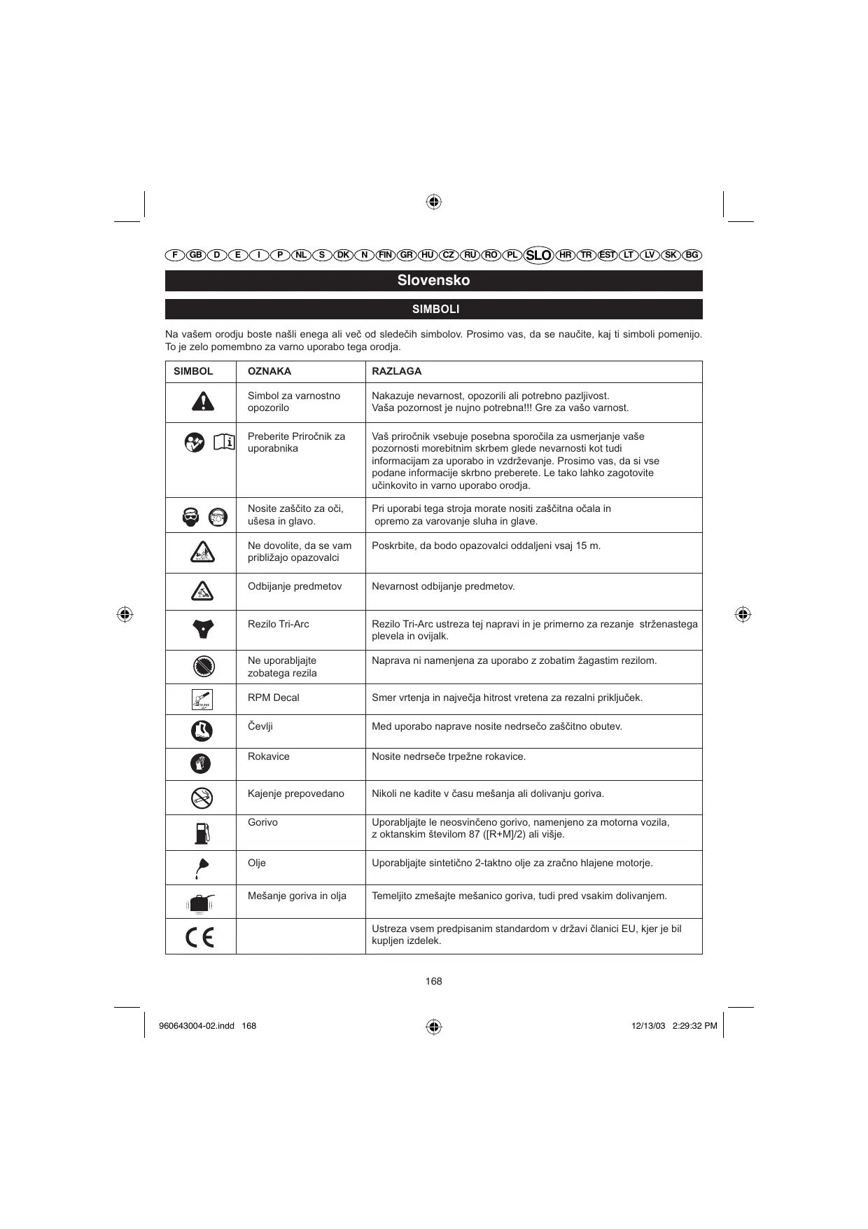 Slovensko SIMBOLI Na vašem orodju boste našli enega ali več od sledečih simbolov. Prosimo vas, da se naučite, kaj ti simboli pomenijo. To je zelo pomembno za varno uporabo tega orodja. SIMBOL OZNAKA RAZLAGA Simbol za varnostno opozorilo Nakazuje nevarnost, opozorili ali potrebno pazljivost. Vaša pozornost je nujno potrebna!!! Gre za vašo varnost. Preberite Priročnik za uporabnika Vaš priročnik vsebuje posebna sporočila za usmerjanje vaše pozornosti morebitnim skrbem glede nevarnosti kot tudi informacijam za uporabo in vzdrževanje. Prosimo vas, da si vse podane informacije skrbno preberete. Le tako lahko zagotovite učinkovito in varno uporabo orodja. Nosite zaščito za oči, ušesa in glavo. Pri uporabi tega stroja morate nositi zaščitna očala in opremo za varovanje sluha in glave. Ne dovolite, da se vam približajo opazovalci Poskrbite, da bodo opazovalci oddaljeni vsaj 15 m. Odbijanje predmetov Nevarnost odbijanje predmetov. Rezilo Tri-Arc Rezilo Tri-Arc ustreza tej napravi in je primerno za rezanje strženastega plevela in ovijalk. Ne uporabljajte zobatega rezila Naprava ni namenjena za uporabo z zobatim žagastim rezilom. RPM Decal Smer vrtenja in največja hitrost vretena za rezalni priključek. Čevlji Med uporabo naprave nosite nedrsečo zaščitno obutev. Rokavice Nosite nedrseče trpežne rokavice. Kajenje prepovedano Nikoli ne kadite v času mešanja ali dolivanju goriva. Gorivo Uporabljajte le neosvinčeno gorivo, namenjeno za motorna vozila, z oktanskim številom 87 ([R+M]/2) ali višje. Olje Uporabljajte sintetično 2-taktno olje za zračno hlajene motorje. Mešanje goriva in olja Temeljito zmešajte mešanico goriva, tudi pred vsakim dolivanjem. Ustreza vsem predpisanim standardom v državi članici EU, kjer je bil kupljen izdelek.