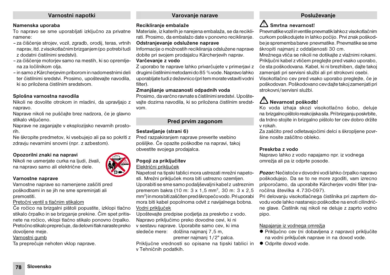 Varnostni napotki Namenska uporaba To napravo se sme uporabljati izključno za privatne namene: – za čiščenje strojev, vozil, zgradb, orodij, teras, vrtnih naprav, itd. z visokotlačnim brizganjem (po potrebi tudi z dodatni čistilnimi sredstvi). – za čiščenje motorjev samo na mestih, ki so opremljena za ločilnikom olja. – in samo z Kärcherjevim priborom in nadomestnimi deli ter čistilnimi sredstvi. Prosimo, upoštevajte navodila, ki so priložena čistilnim sredstvom. Splošna varnostna navodila Nikoli ne dovolite otrokom in mladini, da upravljajo z napravo. Naprave nikoli ne puščajte brez nadzora, če je glavno stikalo vključeno. Naprave ne zaganjajte v eksplozijsko nevarnih prostorih. Ne škropite predmetov, ki vsebujejo ali pa so pokriti z zdravju nevarnimi snovmi (npr. z azbestom). Opozorilni znaki na napravi Nikoli ne usmerjate curka na ljudi, živali, na napravo samo ali električne dele. Varnostne naprave Varnostne naprave so namenjene zaščiti pred poškodbami in se jih ne sme spreminjati ali premostiti. Pretočni ventil s tlačnim stikalom Če ročico na brizgalni pištoli popustite, izklopi tlačno stikalo črpalko in se brizganje prekine. Čim spet pritisnete na ročico, vklopi tlačno stikalo ponovno črpalko. Pretočno stikalo preprečuje, da delovni tlak naraste preko dovoljene meje. Varnostni gumb Ta preprečuje nehoten vklop naprave.