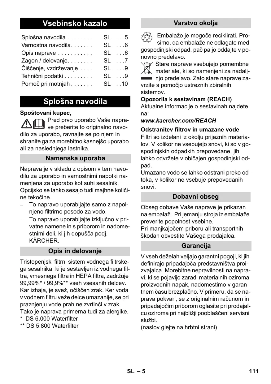 - DS 6.000 Waterfilter ** DS 5.800 Waterfilter Embalažo je mogoče reciklirati. Prosimo, da embalaže ne odlagate med gospodinjski odpad, pač pa jo oddajte v ponovno predelavo. Stare naprave vsebujejo pomembne materiale, ki so namenjeni za nadaljnjo predelavo. Zato stare naprave zavrzite s pomočjo ustreznih zbiralnih sistemov. Opozorila k sestavinam (REACH) Aktualne informacije o sestavinah najdete na: www.kaercher.com/REACH Odstranitev filtrov in umazane vode Filtri so izdelani iz okolju prijaznih materialov. V kolikor ne vsebujejo snovi, ki so v gospodinjskih odpadkih prepovedane, jih lahko odvržete v običajen gospodinjski odpad. Umazano vodo se lahko odstrani preko odtoka, v kolikor ne vsebuje prepovedanih snovi. Dobavni obseg Obseg dobave Vaše naprave je prikazan na embalaži. Pri jemanju stroja iz embalaže preverite popolnost vsebine. Pri manjkajočem priboru ali transportnih škodah obvestite Vašega prodajalca. Garancija V vseh deželah veljajo garantni pogoji, ki jih definirajo pripadajoča predstavništva proizvajalca. Morebitne nepravilnosti na napravi, ki se pojavijo zaradi materialnih oziroma proizvodnih napak, nadomestimo v garantnem času brezplačno. V primeru, da se naprava pokvari, se z originalnim računom in pripadajočim priborom oglasite pri prodajalcu oziroma pri najbližji pooblaščeni servisni službi. (naslov glejte na hrbtni strani) SL – 5