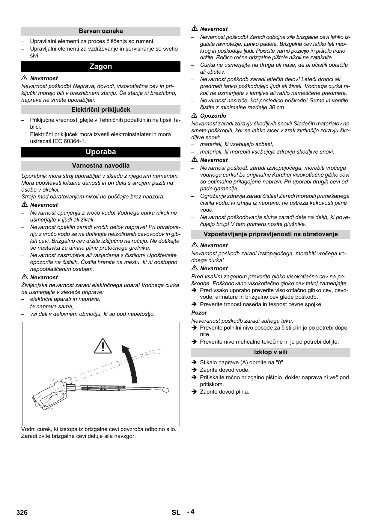 Nevarnost poškodb! Zaradi odbojne sile brizgalne cevi lahko izgubite ravnotežje. Lahko padete. Brizgalna cev lahko leti naokrog in poškoduje ljudi. Poiščite varno pozicijo in pištolo trdno držite. Ročico ročne brizgalne pištole nikoli ne zataknite. – Curka ne usmerjajte na druga ali nase, da bi očistili oblačila ali obutev. – Nevarnost poškodb zaradi letečih delov! Leteči drobci ali predmeti lahko poškodujejo ljudi ali živali. Vodnega curka nikoli ne usmerjajte v lomljive ali rahlo nameščene predmete. – Nevarnost nesreče, kot posledice poškodb! Gume in ventile čistite z minimalne razdalje 30 cm. 몇 Opozorilo Nevarnost zaradi zdravju škodljivih snovi! Sledečih materialov ne smete poškropiti, ker se lahko sicer v zrak zvrtinčijo zdravju škodljive snovi: – materiali, ki vsebujejo azbest, – materiali, ki morebiti vsebujejo zdravju škodljive snovi. Nevarnost – Nevarnost poškodb zaradi izstopajočega, morebiti vročega vodnega curka! Le originalne Kärcher visokotlačne gibke cevi so optimalno prilagojene napravi. Pri uporabi drugih cevi odpade garancija. – Ogrožanje zdravja zaradi čistila! Zaradi morebiti primešanega čistila voda, ki izhaja iz naprave, ne ustreza kakovosti pitne vode. – Nevarnost poškodovanja sluha zaradi dela na delih, ki povečujejo hrup! V tem primeru nosite glušnike.