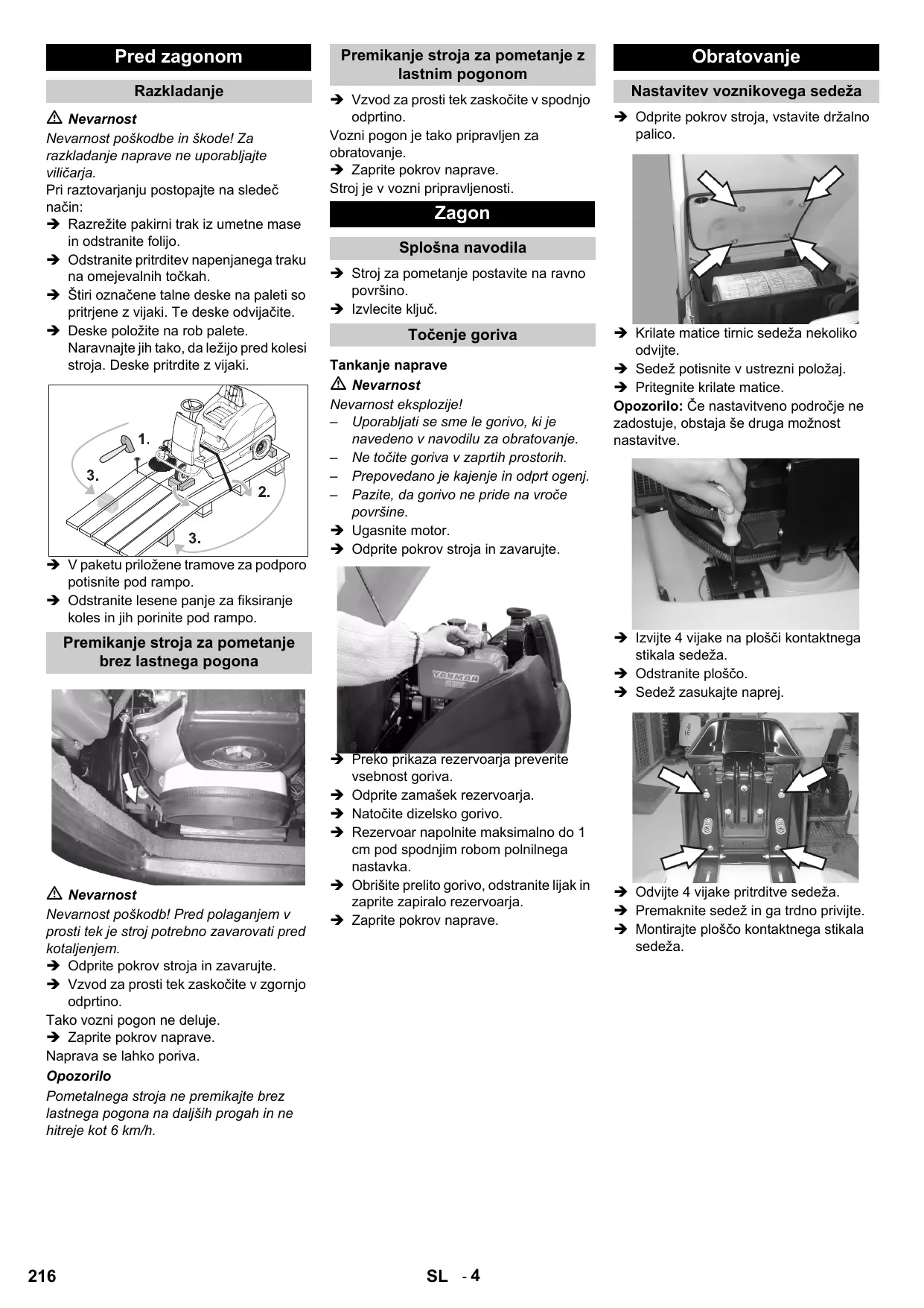 Nastavitev voznikovega sedeža Î Odprite pokrov stroja, vstavite držalno palico. Zagon Splošna navodila Î Stroj za pometanje postavite na ravno površino. Î Izvlecite ključ. Točenje goriva Tankanje naprave Nevarnost Nevarnost eksplozije! – Uporabljati se sme le gorivo, ki je navedeno v navodilu za obratovanje. – Ne točite goriva v zaprtih prostorih. – Prepovedano je kajenje in odprt ogenj. – Pazite, da gorivo ne pride na vroče površine. Î Ugasnite motor. Î Odprite pokrov stroja in zavarujte. Î Krilate matice tirnic sedeža nekoliko odvijte. Î Sedež potisnite v ustrezni položaj. Î Pritegnite krilate matice. Opozorilo: Če nastavitveno področje ne zadostuje, obstaja še druga možnost nastavitve. Î Izvijte 4 vijake na plošči kontaktnega stikala sedeža. Î Odstranite ploščo. Î Sedež zasukajte naprej. Premikanje stroja za pometanje brez lastnega pogona Nevarnost Obratovanje Î Preko prikaza rezervoarja preverite vsebnost goriva. Î Odprite zamašek rezervoarja. Î Natočite dizelsko gorivo. Î Rezervoar napolnite maksimalno do 1 cm pod spodnjim robom polnilnega nastavka. Î Obrišite prelito gorivo, odstranite lijak in zaprite zapiralo rezervoarja. Î Zaprite pokrov naprave. SL - 4 Î Odvijte 4 vijake pritrditve sedeža. Î Premaknite sedež in ga trdno privijte. Î Montirajte ploščo kontaktnega stikala sedeža. Izbira programa Vožnja stroja Nevarnost Nevarnost padca! Med vožnjo ne vstajajte. Vožnja naprej