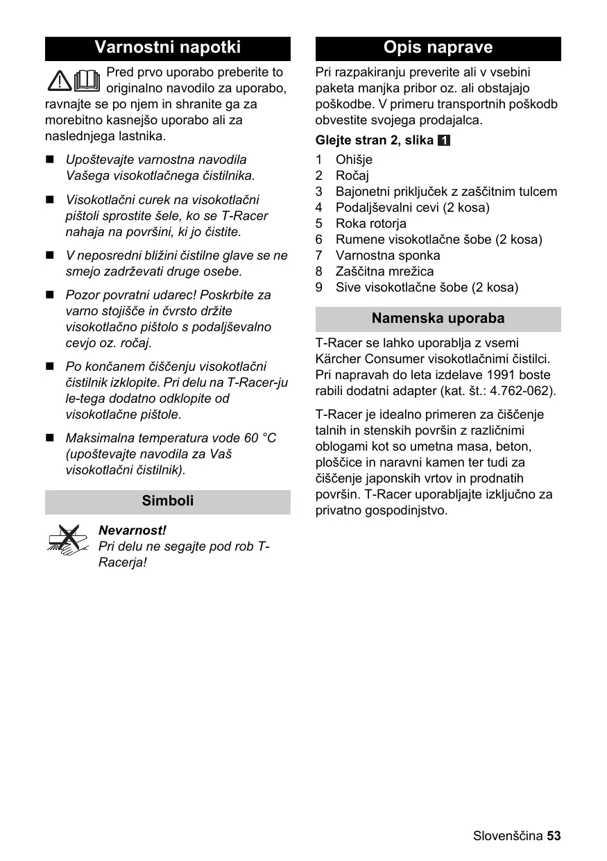 Namenska uporaba T-Racer se lahko uporablja z vsemi Kärcher Consumer visokotlačnimi čistilci. Pri napravah do leta izdelave 1991 boste rabili dodatni adapter (kat. št.: 4.762-062). T-Racer je idealno primeren za čiščenje talnih in stenskih površin z različnimi oblogami kot so umetna masa, beton, ploščice in naravni kamen ter tudi za čiščenje japonskih vrtov in prodnatih površin. T-Racer uporabljajte izključno za privatno gospodinjstvo.
