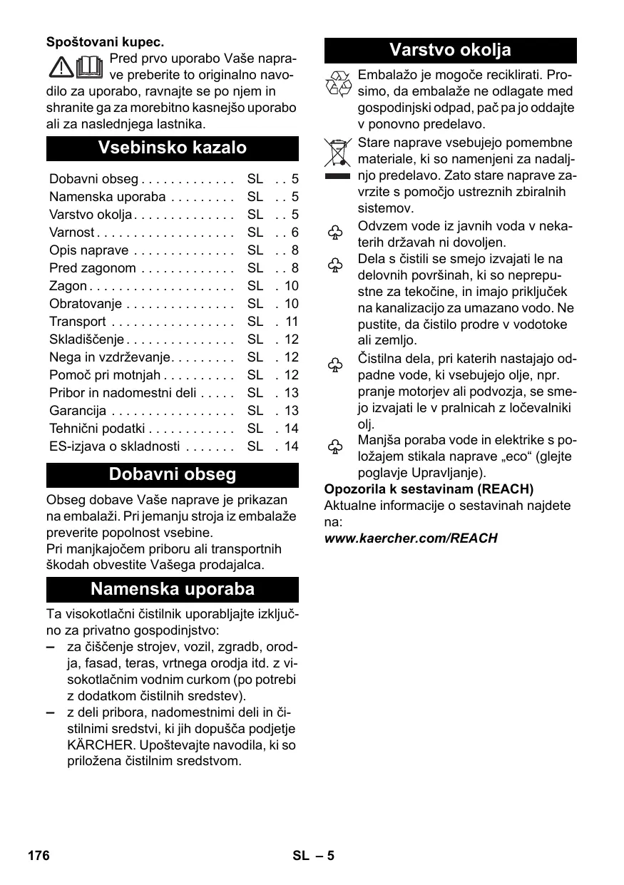 Dobavni obseg Obseg dobave Vaše naprave je prikazan na embalaži. Pri jemanju stroja iz embalaže preverite popolnost vsebine. Pri manjkajočem priboru ali transportnih škodah obvestite Vašega prodajalca. Varstvo okolja Embalažo je mogoče reciklirati. Prosimo, da embalaže ne odlagate med gospodinjski odpad, pač pa jo oddajte v ponovno predelavo. Stare naprave vsebujejo pomembne materiale, ki so namenjeni za nadaljnjo predelavo. Zato stare naprave zavrzite s pomočjo ustreznih zbiralnih sistemov. Odvzem vode iz javnih voda v nekaterih državah ni dovoljen. Dela s čistili se smejo izvajati le na delovnih površinah, ki so neprepustne za tekočine, in imajo priključek na kanalizacijo za umazano vodo. Ne pustite, da čistilo prodre v vodotoke ali zemljo. Čistilna dela, pri katerih nastajajo odpadne vode, ki vsebujejo olje, npr. pranje motorjev ali podvozja, se smejo izvajati le v pralnicah z ločevalniki olj. Manjša poraba vode in elektrike s položajem stikala naprave „eco“ (glejte poglavje Upravljanje). Opozorila k sestavinam (REACH) Aktualne informacije o sestavinah najdete na: www.kaercher.com/REACH Namenska uporaba Ta visokotlačni čistilnik uporabljajte izključno za privatno gospodinjstvo: – za čiščenje strojev, vozil, zgradb, orodja, fasad, teras, vrtnega orodja itd. z visokotlačnim vodnim curkom (po potrebi z dodatkom čistilnih sredstev). – z deli pribora, nadomestnimi deli in čistilnimi sredstvi, ki jih dopušča podjetje KÄRCHER. Upoštevajte navodila, ki so priložena čistilnim sredstvom.