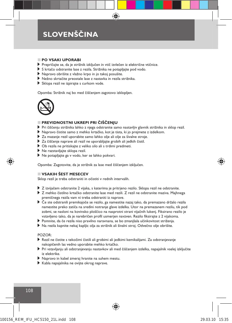 SLOVENŠČINA Vašega strižnika ni mogoče preveč napolniti. Če izdelka ne boste uporabljali dalj časa (2–3 mesece), ga izključite iz vtičnice in spravite. Pred ponovno uporabo strižnik popolnoma napolnite. Da bi ohranili čim daljšo življenjsko dobo baterij, jih vsakih šest mesecev popolnoma izpraznite in nato polnite 14–16 ur. 100156_REM_IFU_HC5150_21L.indd 105