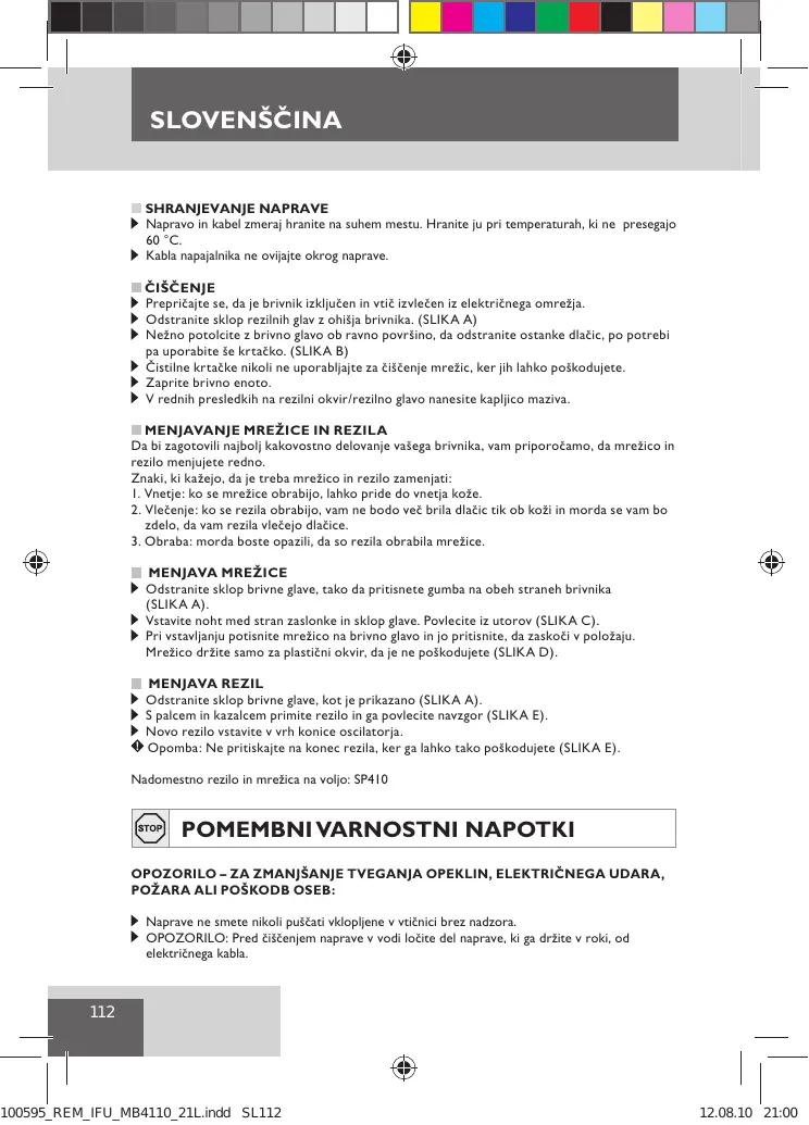 SLOVENŠČINA SHRANJEVANJE NAPRAVE Napravo in kabel zmeraj hranite na suhem mestu. Hranite ju pri temperaturah, ki ne presegajo 60 °C. Kabla napajalnika ne ovijajte okrog naprave. ČIŠČENJE Prepričajte se, da je brivnik izključen in vtič izvlečen iz električnega omrežja. Odstranite sklop rezilnih glav z ohišja brivnika. (SLIKA A) Nežno potolcite z brivno glavo ob ravno površino, da odstranite ostanke dlačic, po potrebi pa uporabite še krtačko. (SLIKA B) Čistilne krtačke nikoli ne uporabljajte za čiščenje mrežic, ker jih lahko poškodujete. Zaprite brivno enoto. V rednih presledkih na rezilni okvir/rezilno glavo nanesite kapljico maziva. MENJAVANJE MREŽICE IN REZILA Da bi zagotovili najbolj kakovostno delovanje vašega brivnika, vam priporočamo, da mrežico in rezilo menjujete redno. Znaki, ki kažejo, da je treba mrežico in rezilo zamenjati: 1. Vnetje: ko se mrežice obrabijo, lahko pride do vnetja kože. 2. Vlečenje: ko se rezila obrabijo, vam ne bodo več brila dlačic tik ob koži in morda se vam bo zdelo, da vam rezila vlečejo dlačice. 3. Obraba: morda boste opazili, da so rezila obrabila mrežice. MENJAVA MREŽICE Odstranite sklop brivne glave, tako da pritisnete gumba na obeh straneh brivnika (SLIKA A). Vstavite noht med stran zaslonke in sklop glave. Povlecite iz utorov (SLIKA C). Pri vstavljanju potisnite mrežico na brivno glavo in jo pritisnite, da zaskoči v položaju. Mrežico držite samo za plastični okvir, da je ne poškodujete (SLIKA D). MENJAVA REZIL Odstranite sklop brivne glave, kot je prikazano (SLIKA A). S palcem in kazalcem primite rezilo in ga povlecite navzgor (SLIKA E). Novo rezilo vstavite v vrh konice oscilatorja. Opomba: Ne pritiskajte na konec rezila, ker ga lahko tako poškodujete (SLIKA E). Nadomestno rezilo in mrežica na voljo: SP410