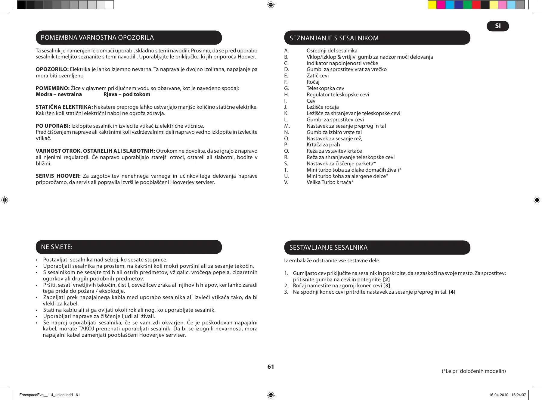 Ta sesalnik je namenjen le domači uporabi, skladno s temi navodili. Prosimo, da se pred uporabo sesalnik temeljito seznanite s temi navodili. Uporabljajte le priključke, ki jih priporoča Hoover.