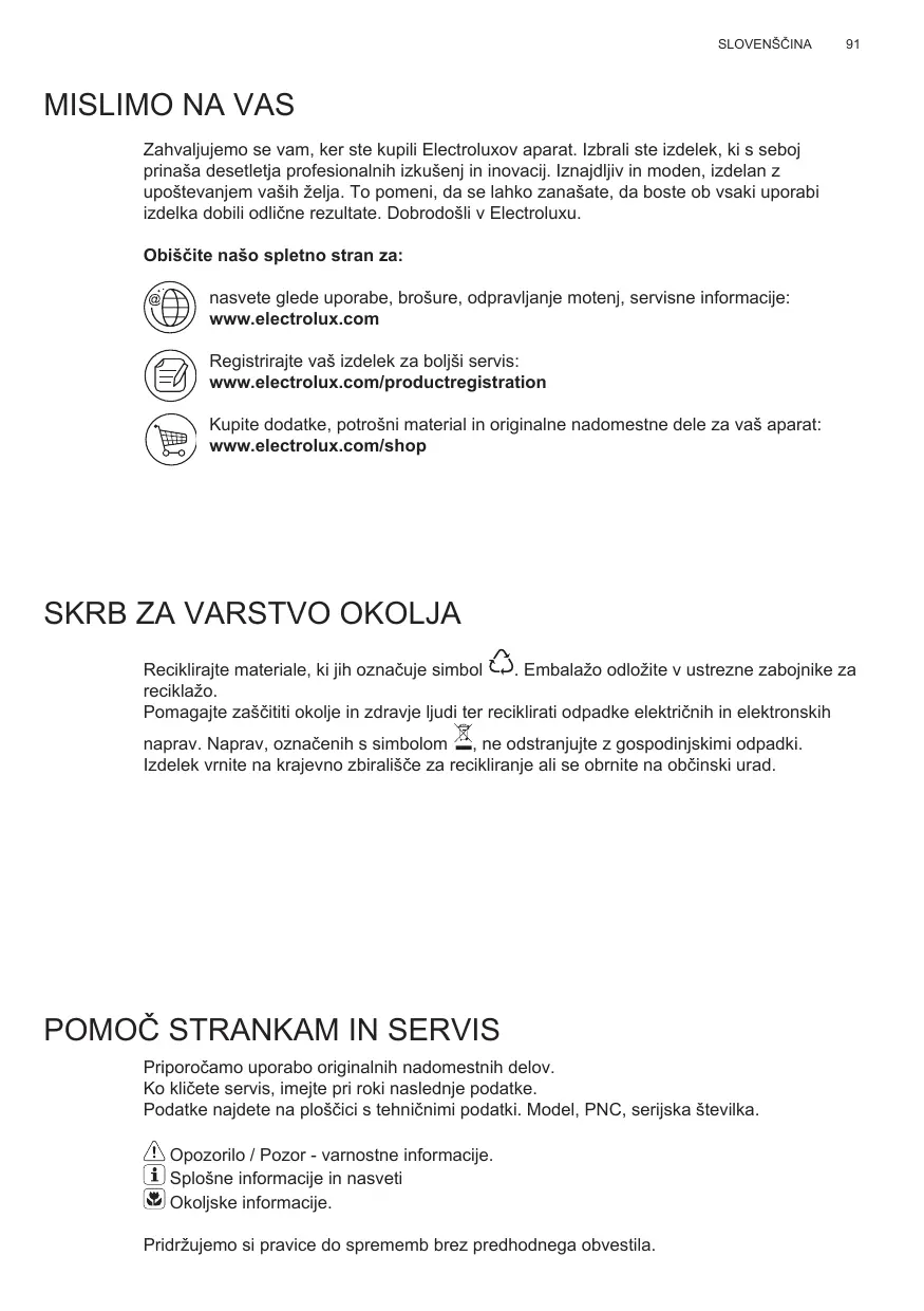 Priporočamo uporabo originalnih nadomestnih delov. Ko kličete servis, imejte pri roki naslednje podatke. Podatke najdete na ploščici s tehničnimi podatki. Model, PNC, serijska številka. Opozorilo / Pozor - varnostne informacije. Splošne informacije in nasveti Okoljske informacije. Pridržujemo si pravice do sprememb brez predhodnega obvestila.