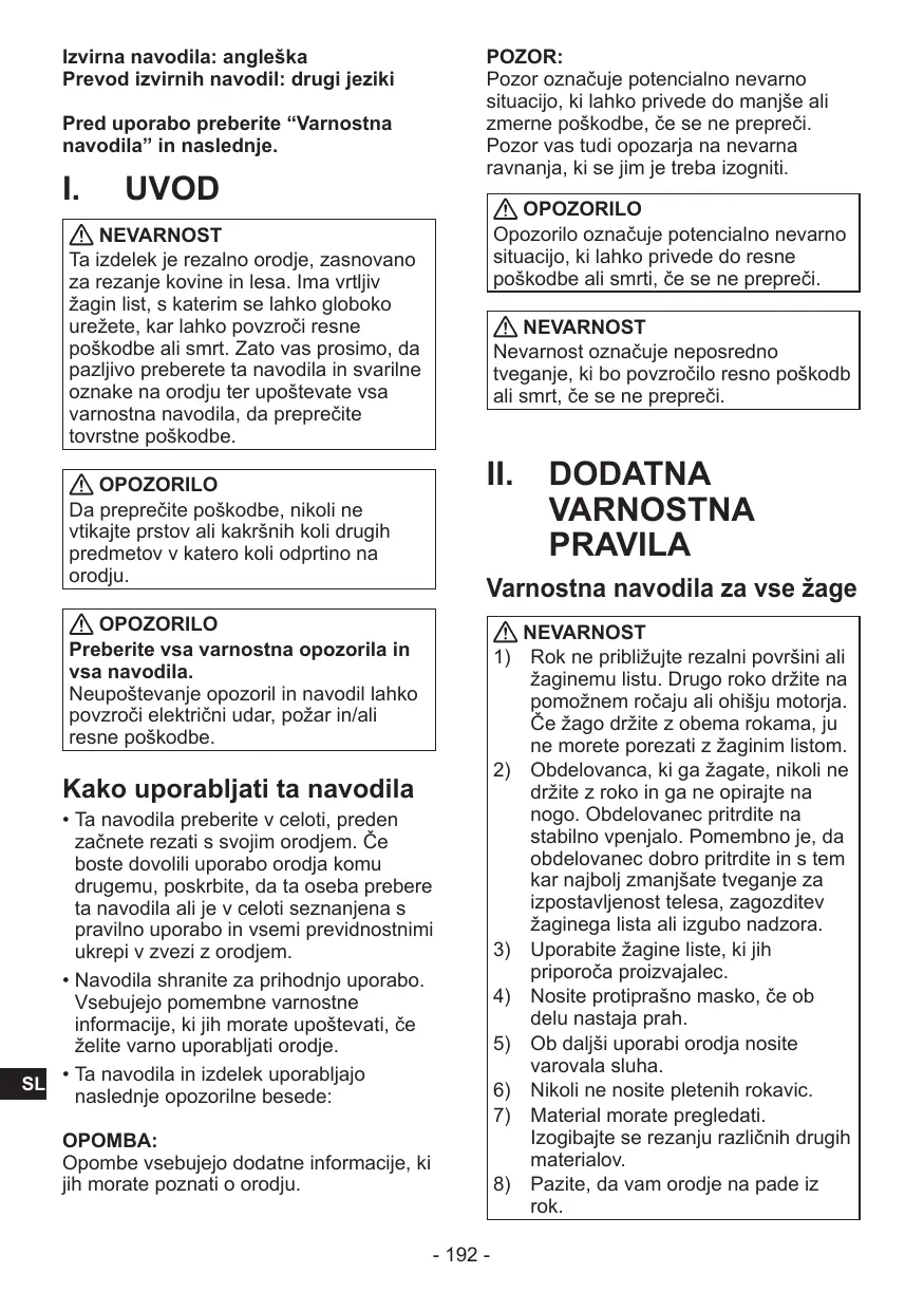 Ta izdelek je rezalno orodje,zasnovano za rezanje kovine in lesa. Ima vrtljiv Žagin list, s katerim se lahko globoko urežete, kar lahko povzroči resne poskodbe ali smrt. Zato vas prosimo, da pazljivo preberete ta navodila in svarilne oznake na orodju ter upostevate vsa varnostna navodila, da preprečite tovrstne poskodbe.
