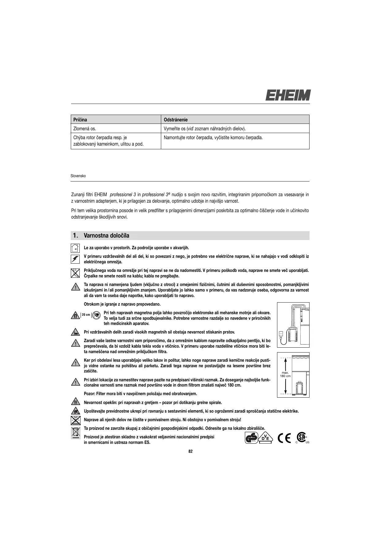 Le za uporabo v prostorih. Za področje uporabe v akvarijih. V primeru vzdrževalnih del ali del, ki so povezani z nego, je potrebno vse električne naprave, ki se nahajajo v vodi odklopiti iz električnega omrežja. Priključnega voda na omrežje pri tej napravi se ne da nadomestiti. V primeru poškodb voda, naprave ne smete več uporabljati. Črpalke ne smete nositi na kablu; kabla ne pregibajte. Ta naprava ni namenjena ljudem (vključno z otroci) z omejenimi fizičnimi, čutnimi ali duševnimi sposobnostmi, pomanjkljivimi izkušnjami in /ali pomanjkljivim znanjem. Uporabljate jo lahko samo v primeru, da vas nadzoruje oseba, odgovorna za varnost ali da vam ta oseba daje napotke, kako uporabljati to napravo. Otrokom je igranje z napravo prepovedano. 20 cm Pri teh napravah magnetna polja lahko povzročijo elektronske ali mehanske motnje ali okvare. To velja tudi za srčne spodbujevalnike. Potrebne varnostne razdalje so navedene v priročnikih teh medicinskih aparatov. Pri vzdrževalnih delih zaradi visokih magnetnih sil obstaja nevarnost stiskanin prstov. Zaradi vaše lastne varnostni vam priporočimo, da z omrežnim kablom napravite odkapljalno pentljo, ki bo preprečevala, da bi vzdolž kabla tekla voda v vtičnico. V primeru uporabe razdelilne vtičnice mora biti leta nameščena nad omrežnim priključkom filtra. Ker pri obdelavi lesa uporabljajo veliko lakov in politur, lahko noge naprave zaradi kemične reakcije pustijo vidne ostanke na pohištvu ali parketu. Zaradi tega naprave ne postavljajte na lesene površine brez zaščite. max. 180 cm Pri izbiri lokacije za namestitev naprave pazite na predpisani višinski razmak. Za doseganje najboljše funkcionalne varnosti sme razmak med površino vode in dnom filtrom znašati največ 180 cm. Pozor: Filter mora biti v navpičnem položaju med obratovanjem. Nevarnost opeklin: pri napravah z gretjem – pozor pri dotikanju grelne spirale. Upoštevajte previdnostne ukrepi pri ravnanju s sestavnimi elementi, ki so ogroženmi zaradi sproščanja statične elektrike. Naprave ali njenih delov ne čistite v pomivalnem stroju. Ni obstojno v pomivalnem stroju! Ta proizvod ne zavrzite skupaj z običajnimi gospodinjskimi odpadki. Odnesite ga na lokalno zbirališče. Proizvod je atestiran skladno z vsakokrat veljavnimi nacionalnimi predpisi in smernicami in ustreza normam ES.