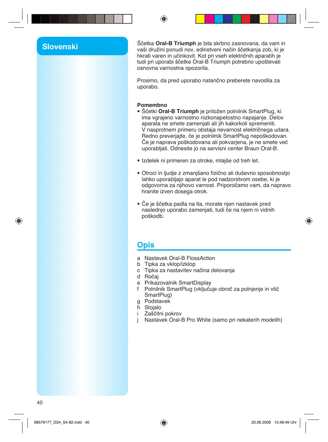 REG + CE En Séetka Oral-B Triumph je bila skrbno zasnovana, da vam in vaëi druzini ponudi nov, edinstveni naëin $éetkanja zob, ki je hkrati varen in uëinkovit. Kot pri vseh elektriënih aparatih je tudi pri uporabi $éetke Oral-B Triumph potrebno upoëtevati osnovna varnostna opozorila. Prosimo, da pred uporabo natanëno preberete navodila za uporabo. Pomembno + Séetki Oral-B Triumph je prilozen polnilnik SmartPlug, ki ima vgrajeno varnostno nizkonapetostno napajanje. Delov aparata ne smete zamenjati ali jih kakorkoli spremeniti. V nasprotnem primeru obstaja nevarnost elektriënega udara. Redno preverjaite, ëe je polnilnik SmartPlug nepoëkodovan. Ce je naprava poëkodovana ali pokvarjena, je ne smete veë uporabljati. Odnesite jo na servisni center Braun Oral-B. + Izdelek ni primeren za otroke, mlajée od treh let. + Otroci in ljudje z zmanj$ano fiziéno ali dusevno sposobnostjo lahko uporabljajo aparat le pod nadzorstvom osebe, ki je odgovorna za njihovo varnost. Priporoëamo vam, da napravo hranite izven dosega otrok. + Ce je Séetka padia na tla, morate njen nastavek pred naslednjo uporabo zamenijati, tudi &e na njem ni vidnih poëkodb.