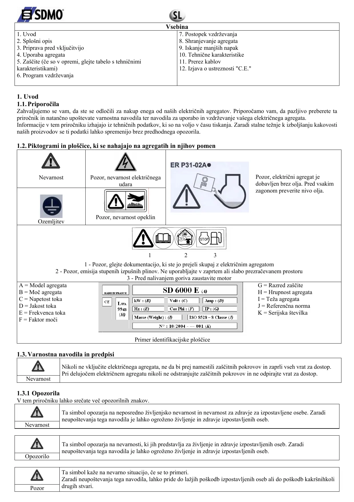 1.1. Priporočila Zahvaljujemo se vam, da ste se odločili za nakup enega od naših električnih agregatov. Priporočamo vam, da pazljivo preberete ta priročnik in natančno upoštevate varnostna navodila ter navodila za uporabo in vzdrževanje vašega električnega agregata. Informacije v tem priročniku izhajajo iz tehničnih podatkov, ki so na voljo v času tiskanja. Zaradi stalne težnje k izboljšanju kakovosti naših proizvodov se ti podatki lahko spremenijo brez predhodnega opozorila. 1.2. Piktogrami in ploščice, ki se nahajajo na agregatih in njihov pomen Nevarnost Ozemljitev Pozor, električni agregat je dobavljen brez olja. Pred vsakim zagonom preverite nivo olja. Pozor, nevarnost električnega udara Pozor, nevarnost opeklin