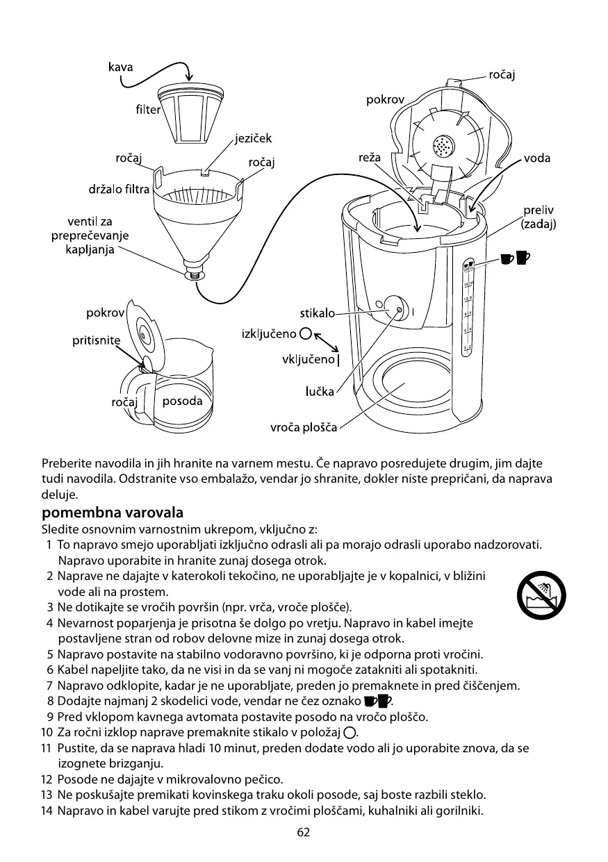 pomembna varovala Sledite osnovnim varnostnim ukrepom, vključno z: 1 To napravo smejo uporabljati izključno odrasli ali pa morajo odrasli uporabo nadzorovati. Napravo uporabite in hranite zunaj dosega otrok. 2 Naprave ne dajajte v katerokoli tekočino, ne uporabljajte je v kopalnici, v bližini vode ali na prostem. 3 Ne dotikajte se vročih površin (npr. vrča, vroče plošče). 4 Nevarnost poparjenja je prisotna še dolgo po vretju. Napravo in kabel imejte postavljene stran od robov delovne mize in zunaj dosega otrok. 5 Napravo postavite na stabilno vodoravno površino, ki je odporna proti vročini. 6 Kabel napeljite tako, da ne visi in da se vanj ni mogoče zatakniti ali spotakniti. 7 Napravo odklopite, kadar je ne uporabljate, preden jo premaknete in pred čiščenjem. 8 Dodajte najmanj 2 skodelici vode, vendar ne čez oznako ;:. 9 Pred vklopom kavnega avtomata postavite posodo na vročo ploščo. 10 Za ročni izklop naprave premaknite stikalo v položaj 0. 11 Pustite, da se naprava hladi 10 minut, preden dodate vodo ali jo uporabite znova, da se izognete brizganju. 12 Posode ne dajajte v mikrovalovno pečico. 13 Ne poskušajte premikati kovinskega traku okoli posode, saj boste razbili steklo. 14 Napravo in kabel varujte pred stikom z vročimi ploščami, kuhalniki ali gorilniki. 62