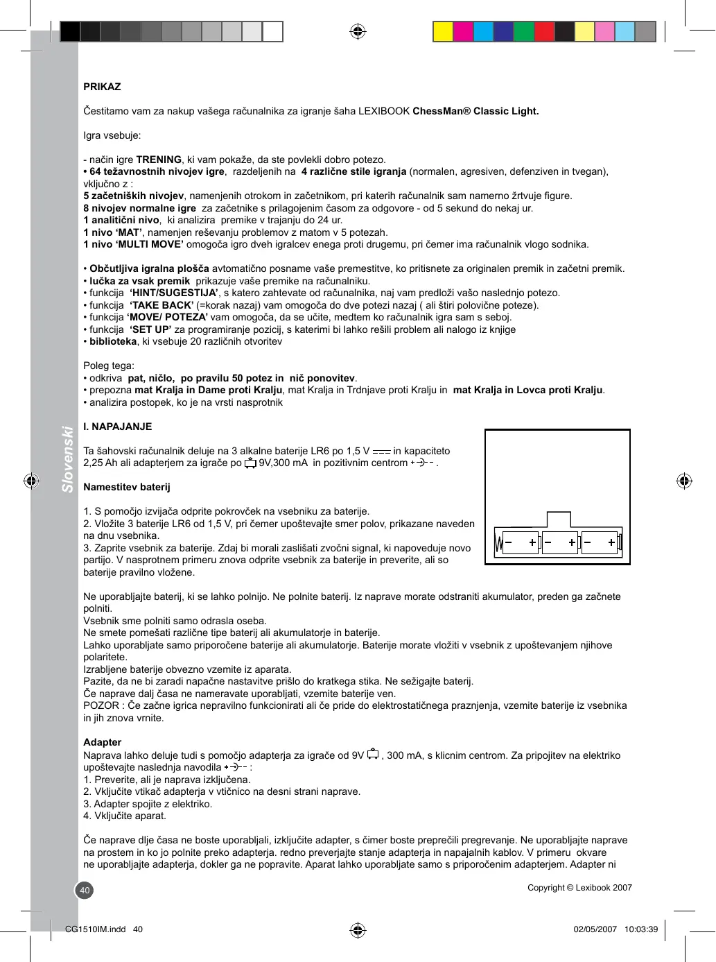1. Ouvrez le couvercle du compartiment à piles à l’aide d’un tournevis. 2. Installez 3 piles LR6 de 1,5 V en respectant le sens des polarités indiqué au fond du compartiment. 3. Refermez le compartiment à piles. Vous devez alors entendre la petite musique annonçant une nouvelle partie. Dans le cas contraire, ouvrez à nouveau le compartiment à piles et vérifiez que les piles sont correctement installées. Ne pas utiliser de piles rechargeables. Ne pas recharger les piles non rechargeables. Les accumulateurs doivent être enlevés du jouet avant d’être chargés. Les accumulateurs ne doivent être chargés que sous la surveillance d’un adulte. Différents types de piles ou accumulateurs ou des piles ou accumulateurs neufs et usagés ne doivent pas être mélangés. Seuls des piles ou accumulateurs de type recommandé ou d’un type similaire doivent être utilisés. Les piles et accumulateurs doivent être mis en place en respectant la polarité. Les piles et accumulateurs usagés doivent être enlevés du jouet. Les bornes d’une pile ou d’un accumulateur ne doivent pas être mises en court-circuit. Ne pas jeter les piles au feu. Retirer les piles en cas de non utilisation prolongée. ATTENTION : si le produit présente un mauvais fonctionnement ou subit des décharges électrostatiques, enlevez puis remettez les piles. Adaptateur Le jeu fonctionne aussi avec un adaptateur pour jouets de 9 V , 300 mA, à centre positif . Pour le branchement, suivez ces instructions : 1. Assurez-vous que l’appareil est éteint. 2. Branchez la fiche de l’adaptateur dans la prise située sur le côté droit du jeu. 3. Branchez l’adaptateur dans une prise de courant. 4. Mettez le jeu en marche. Débranchez l’adaptateur en cas de non-utilisation prolongée afin d’éviter tout échauffement. Lorsque le jeu est alimenté par un adaptateur, ne jouez pas à l’extérieur. Vérifiez régulièrement l’état de l’adaptateur et des fils de branchement. En cas de détérioration, n’utilisez pas l’adaptateur jusqu’à réparation. Le jeu ne doit être utilisé qu’avec l’adaptateur recommandé. Copyright © Lexibook 2007