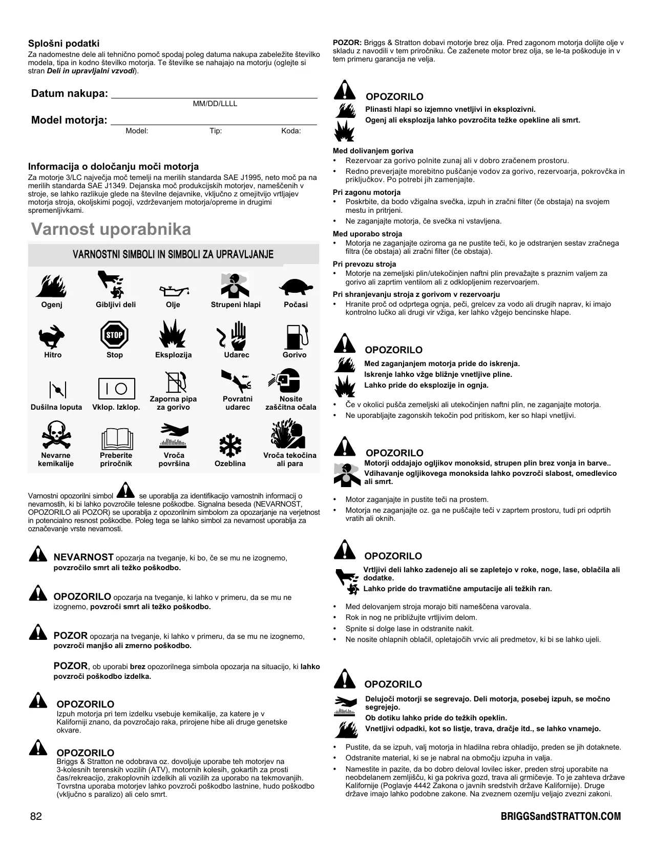 Ogenj Strupeni hlapi Poëasi Hitro Stop Eksplozija Udarec Gorivo N Oro NN “x & Zaporna pipa Povratni Nosite Duëilna loputa Vklop.lzklop. za gorivo udarec zaëëitna oëala ass © A Nevarne Preberite Vroëa Vroëa tekoëina kemikalije priroënik povrëina Ozeblina ali para Vamostni opozorini simbol À se uporablja za identifkacio vamostnih informaci) o nevamosth, ki bi lahko povzroëile telesne poékodbe. Signaina beseda (NEVARNOST, OPOZORILO ali POZOR) se uporablja z opozorinim simbolom za opozarjanie na verjetnost in potencialno resnost poëkodbe. Poleg tega se lahko simbol za nevamost uporablja za oznaëevanje vrste nevarnosti. À nEVARNOST opozaa na tvegani, bo, 6e se mu ne izognemo, povzroëilo smrt ali tezko poëkodbo. PIN OPOZORILO opozarja na tveganje, ki lahko v primeru, da se mu ne izognemo, povzroëi smrt ali tezko poëkodbo. POZOR opozarja na tveganje, ki lahko v primeru, da se mu ne izognemo, povzroëi manjéo ali zmerno poëkodbo. POZOR, ob uporabi brez opozorilnega simbola opozarja na situacijo, ki lahko povzroëi poëkodbo izdelka. OPOZORILO Izpuh motorja pri tem izdelku vsebuje kemikalije, za katere je v Kaliforniji znano, da povzroëajo raka, prirojene hibe li druge genetske okvare. OPOZORILO Briggs & Stratton ne odobrava oz. dovoljuje uporabe teh motorjev na 3-kolesnih terenskih vozili (ATV), motornih kolesih, gokartih za prosti &aslrekreacijo, zrakoplovnih izdelkih ali vozilih za uporabo na tekmovanjih. Tovrstna uporaba motorjev lahko povzroëi poëkodbo lastnine, hudo poëkodbo {kjuëno s paralizo) ali celo smr.
